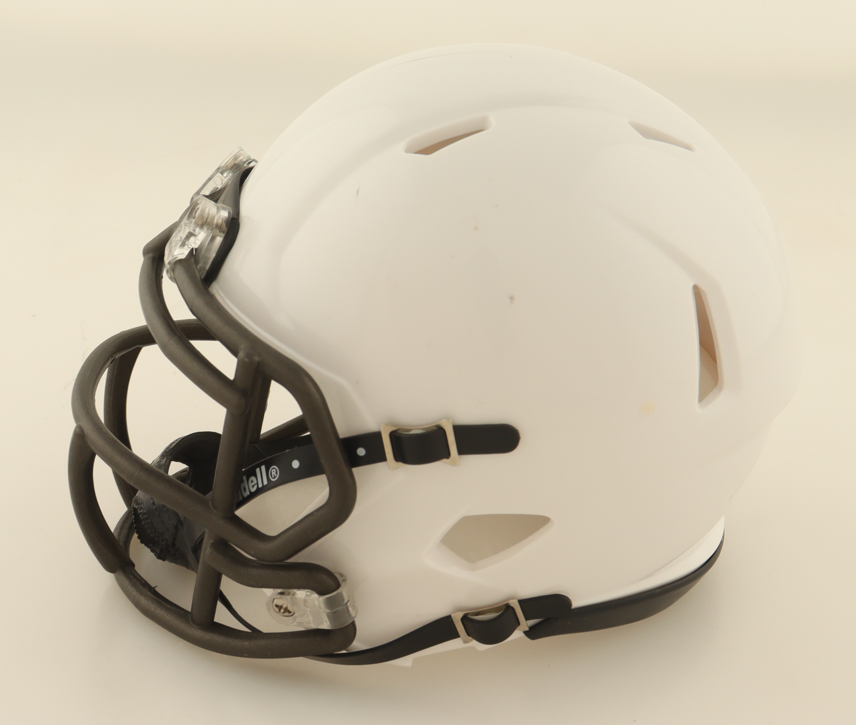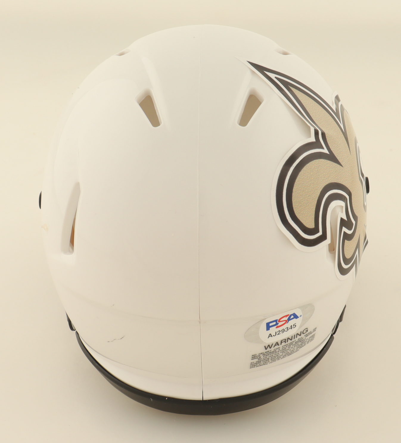Riddell New Orleans Saints speed mini helmet. Hand-signed by Spencer Rattler. Please note the left decal is missing, and the are is scuffed around it, see photos for more details.