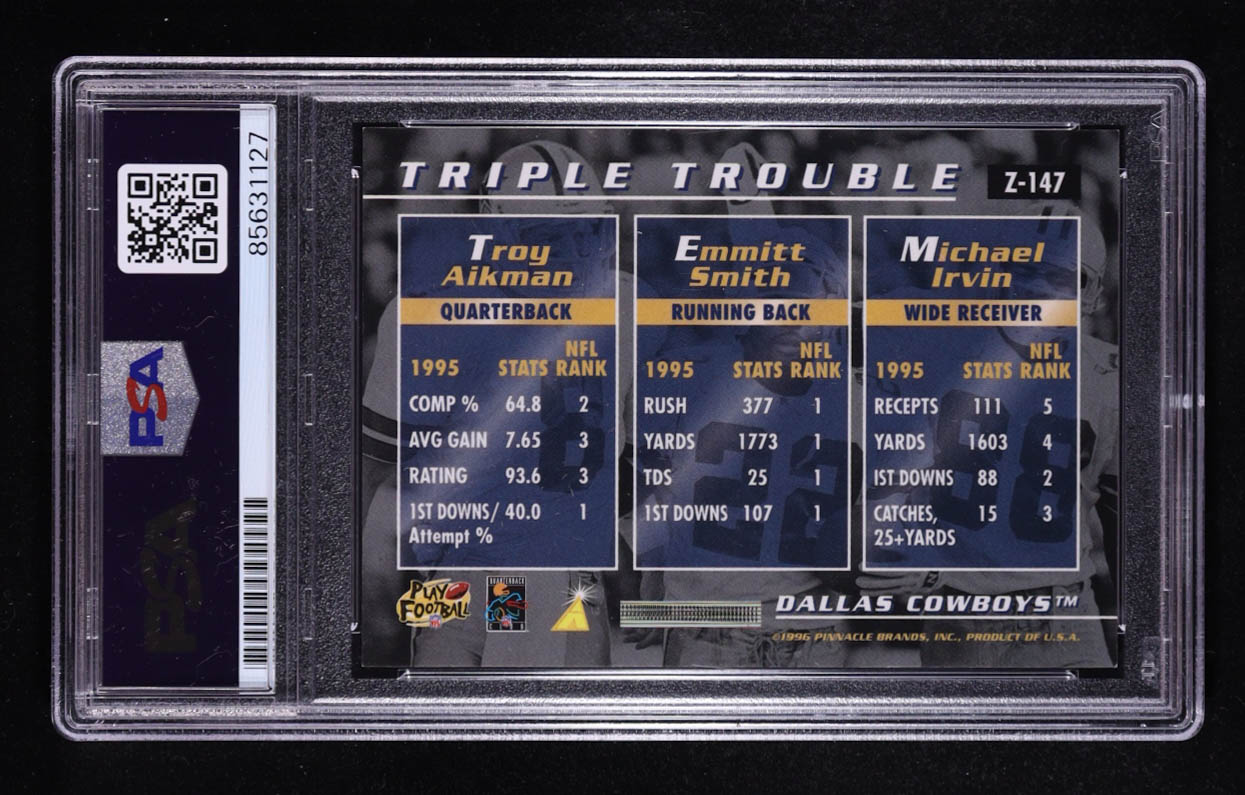 Emmitt Smith, Troy Aikman, and Michael Irvin Signed 1996 Pinnacle Zenith #147 (PSA)