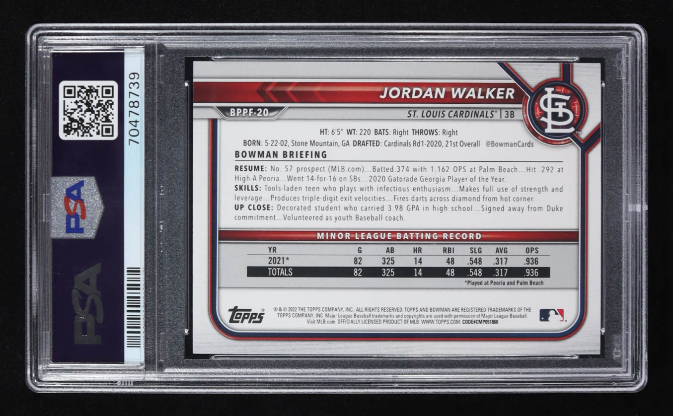 Jordan Walker 2022 Bowman 1st Edition Blue Foil #BPPF20 #62/150 RC (PSA 10)