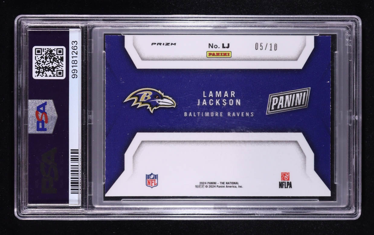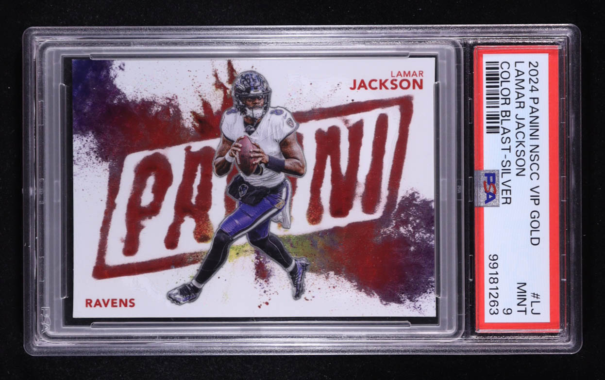 Lamar Jackson 2024 Panini National Convention VIP Gold Packs Color Blast Silver #LJ #05/10 (PSA 9)