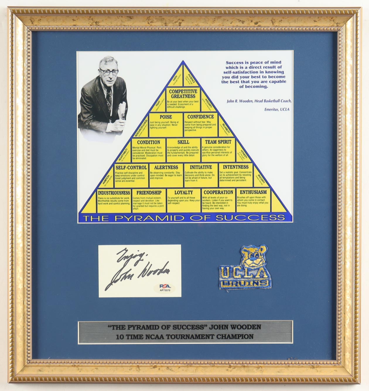 Custom frame measures approximately 16" x 16" in size and features an art print that has been hand-signed and inscribed by John Wooden (D. 2010, UCLA Bruins). The display also includes a vintage UCLA pin.