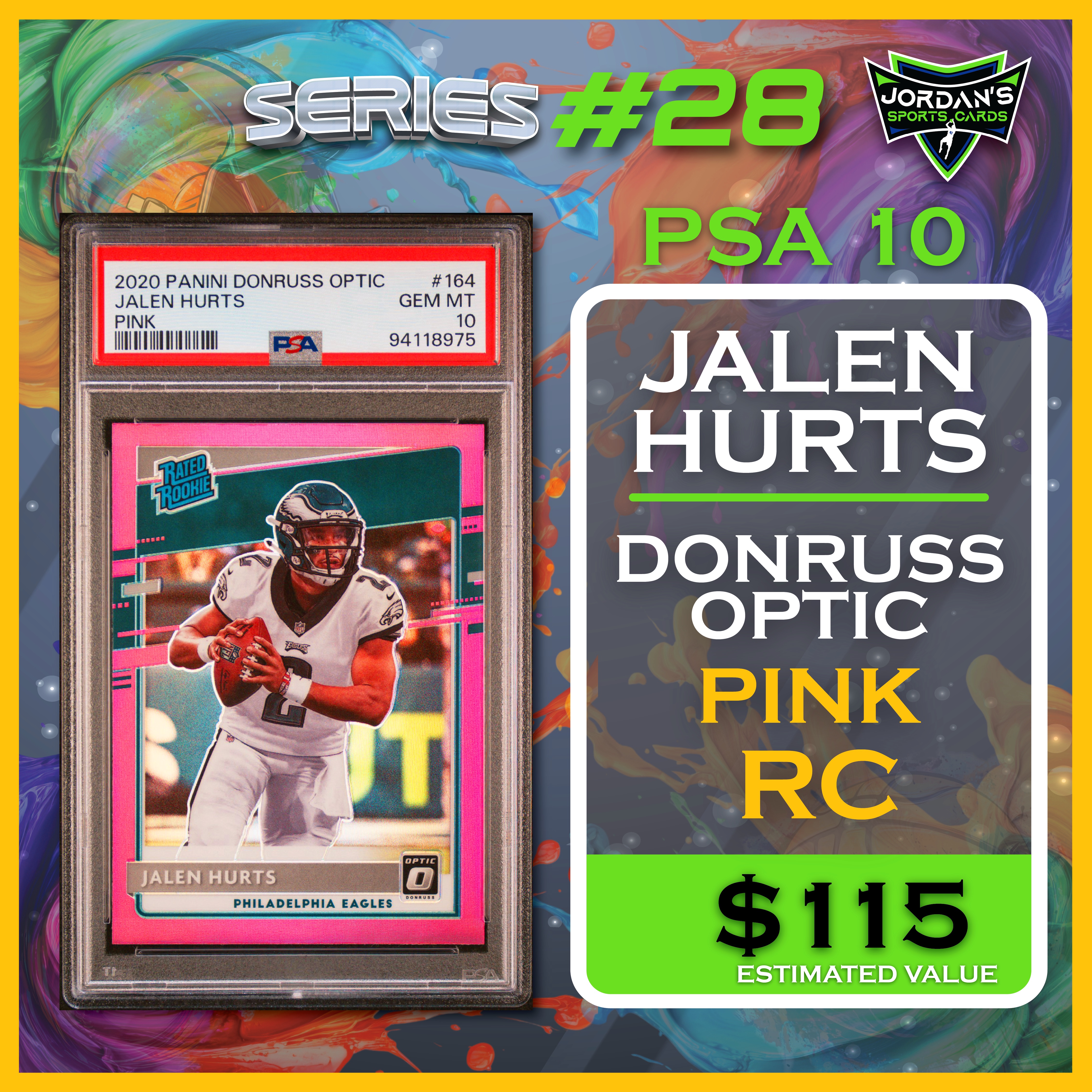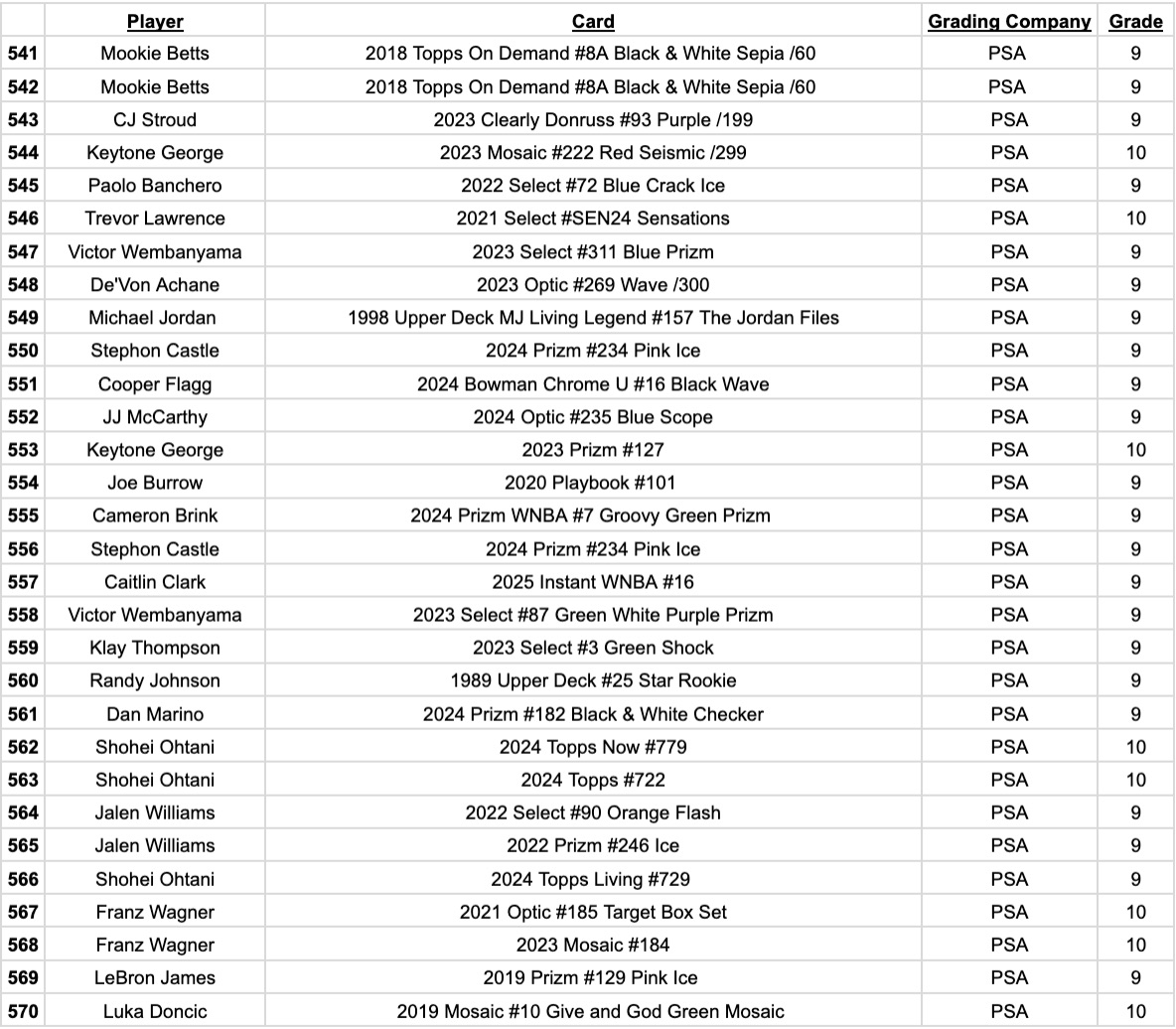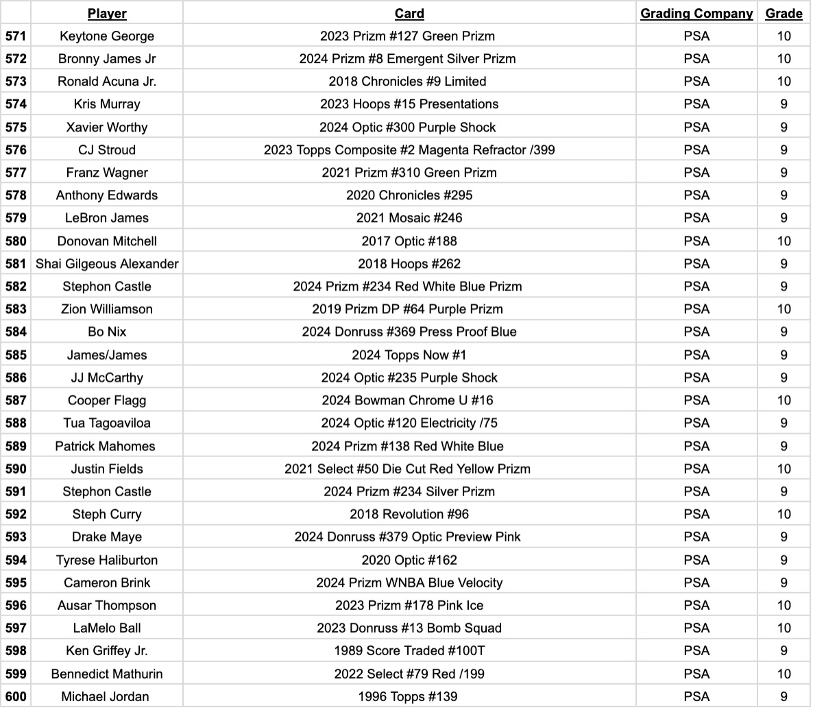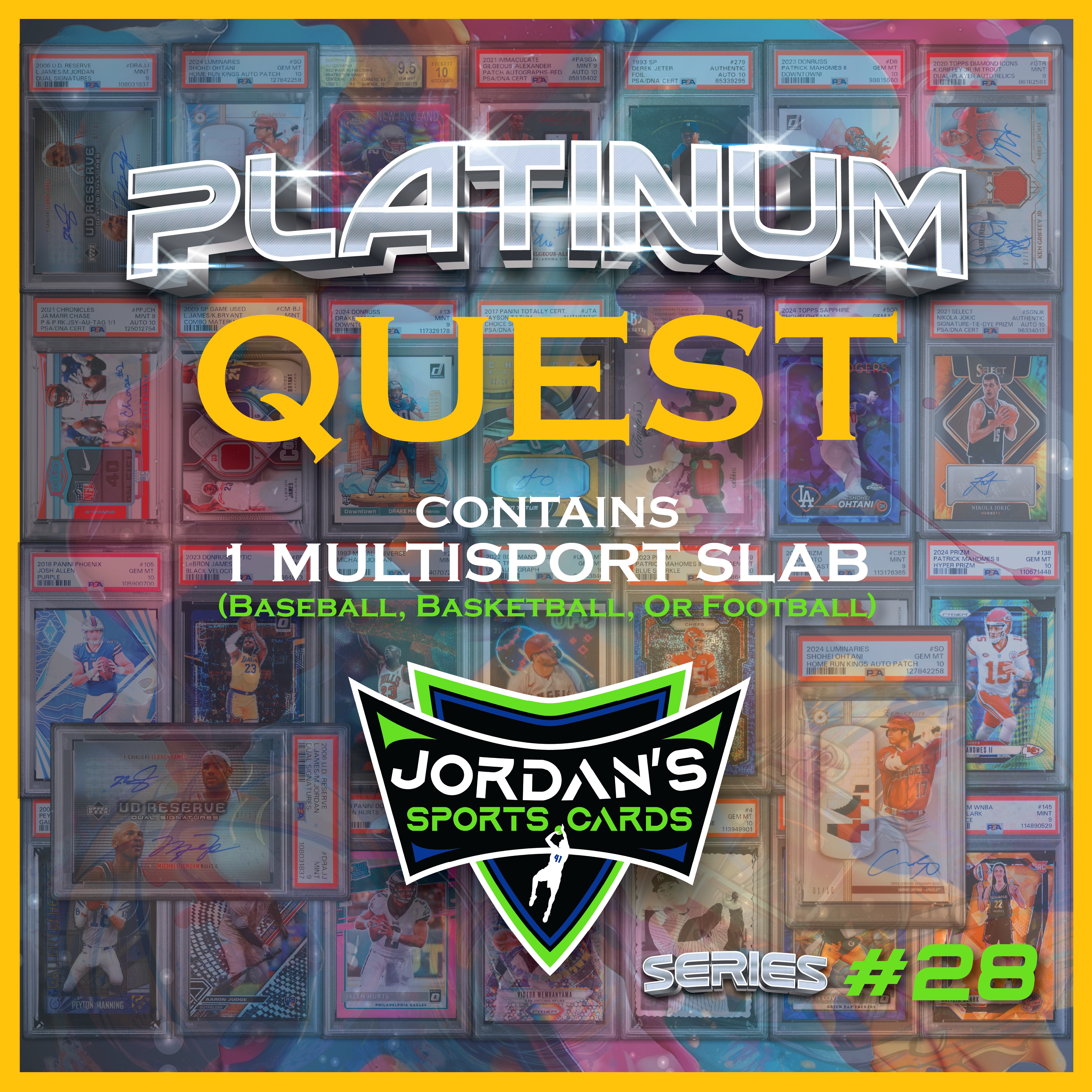 Jordan’s Sports Cards Presents Platinum Quest Series 28: The Sports Card Pack Mystery Pack with (1) PSA or BGS graded baseball, basketball, or football card, including big hits from superstars and hall of famers across all three major sports (600 cards total).