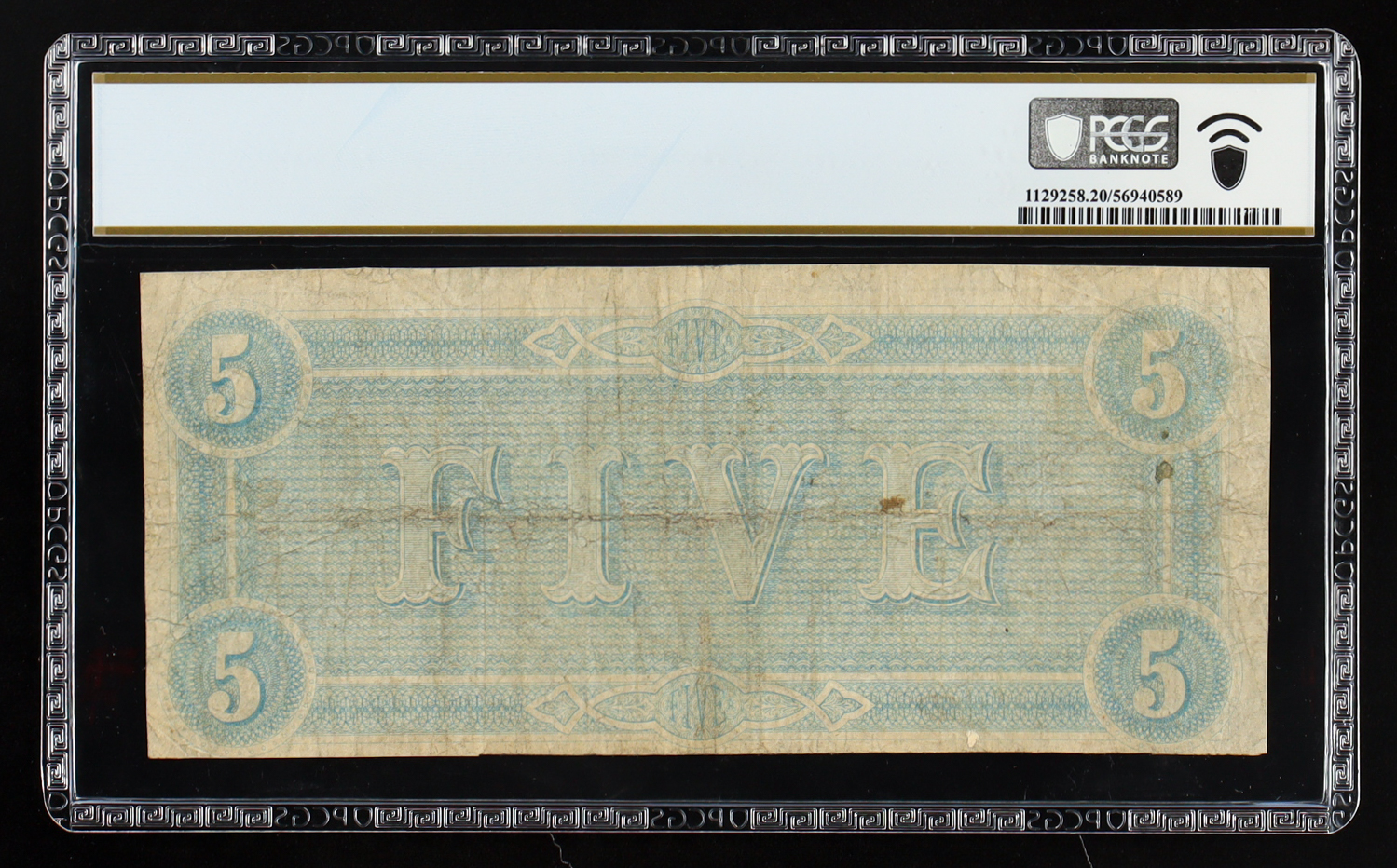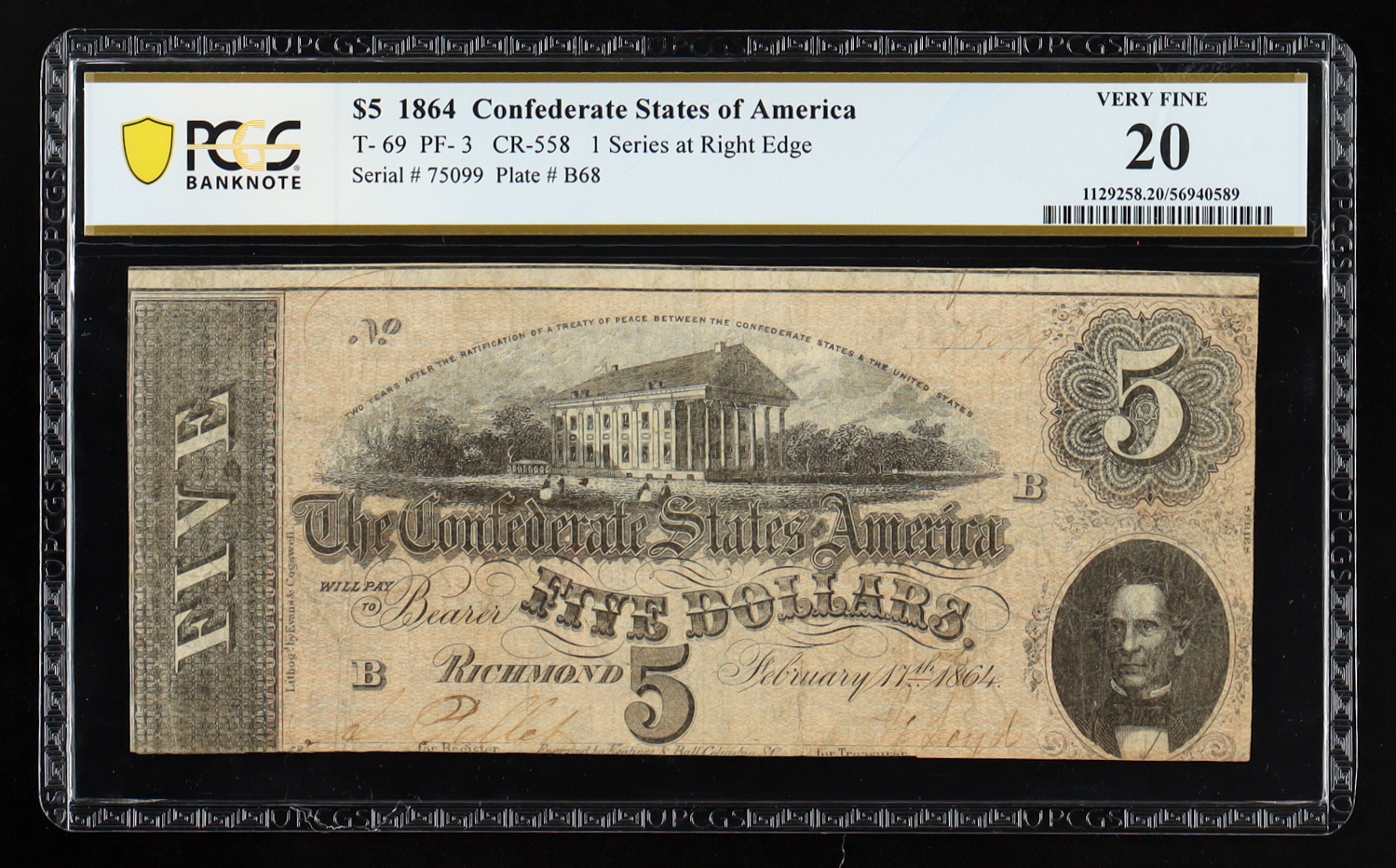1864 Confederate States of America $5 Currency Note T-69, First Series (PCGS Very Fine 20)