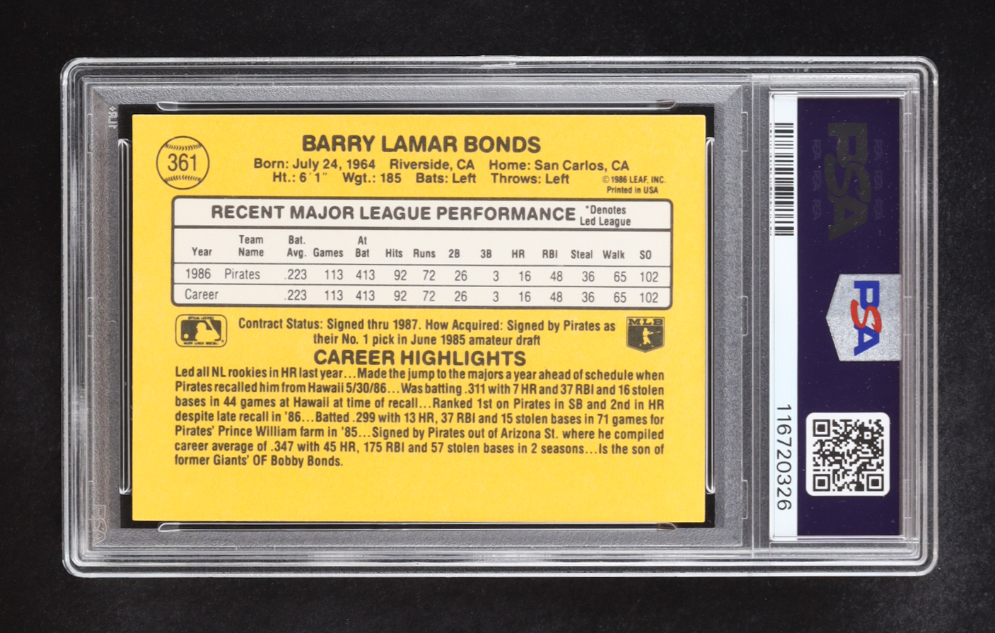 Barry Bonds 1987 Donruss #361 RC (PSA 9)