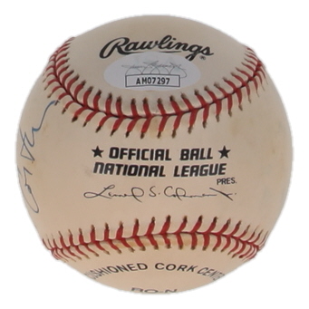 Rawlings Official National League Baseball. Hand-signed by Bob Costas (HOF). The baseball has been personalized "To The Kalthers". Please note, there are stains throughout the baseball.