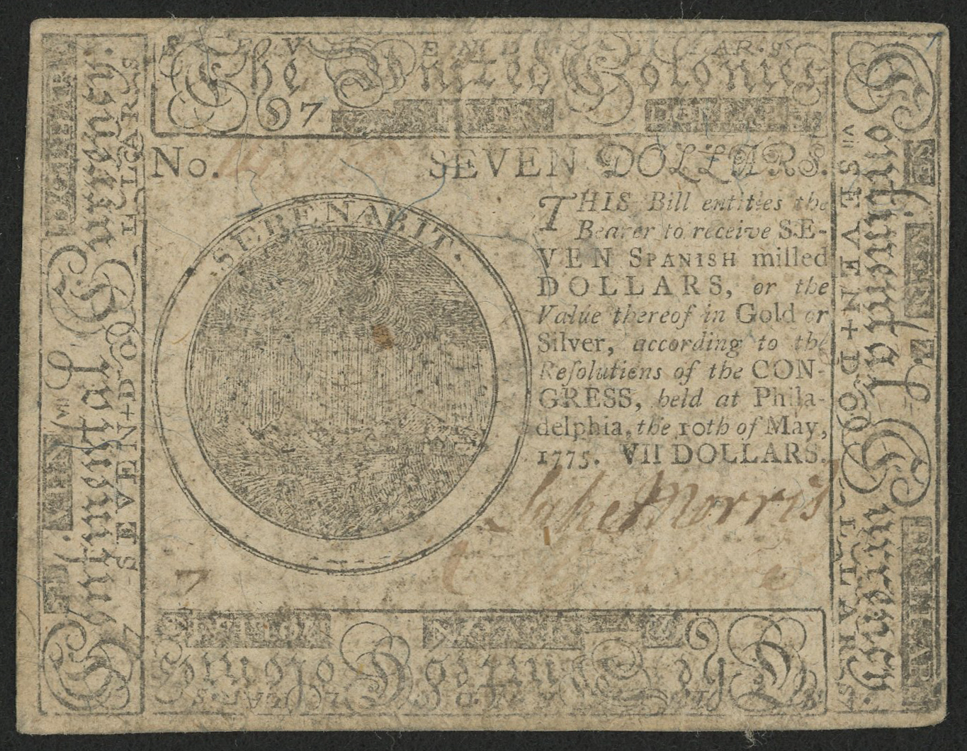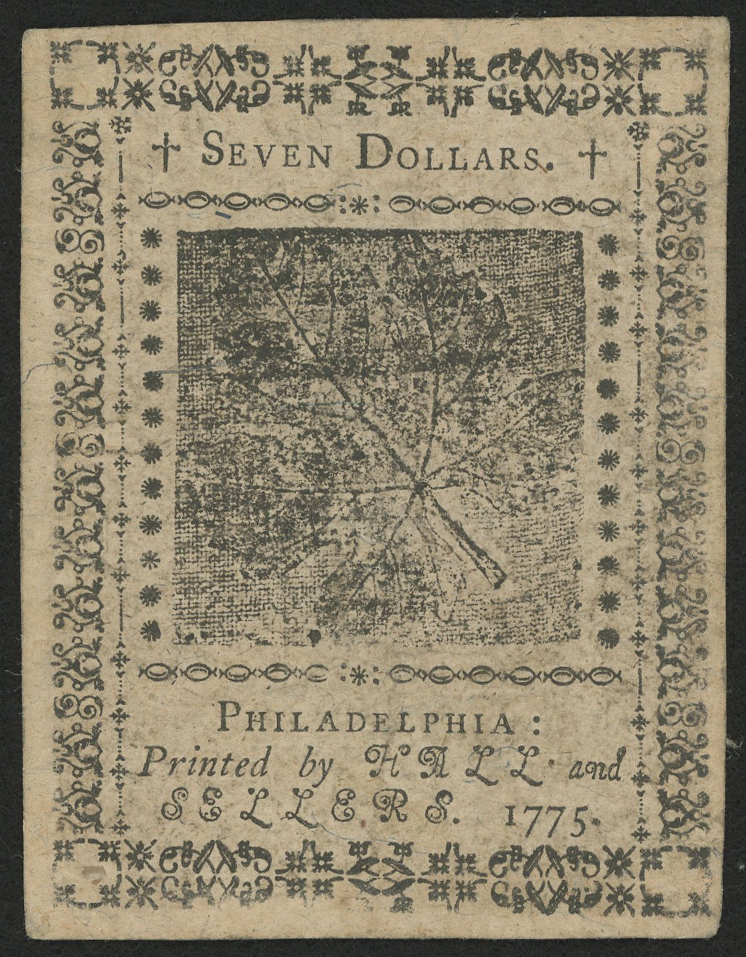 Seven dollar colonial currency note. Issued on May 10th, 1775 and printed by Hall + Sellers.