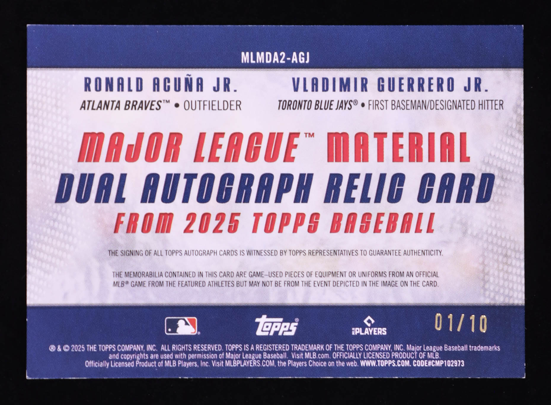 Ronald Acuna Jr. / Vladimir Guerrero Jr. 2025 Topps Dual Major League Materials Autographs Black #MLMDA2AGJ S2 #01/10