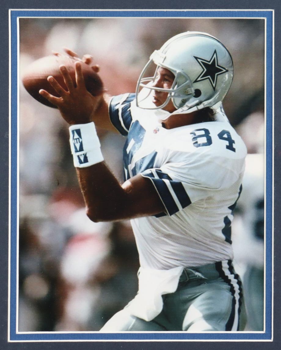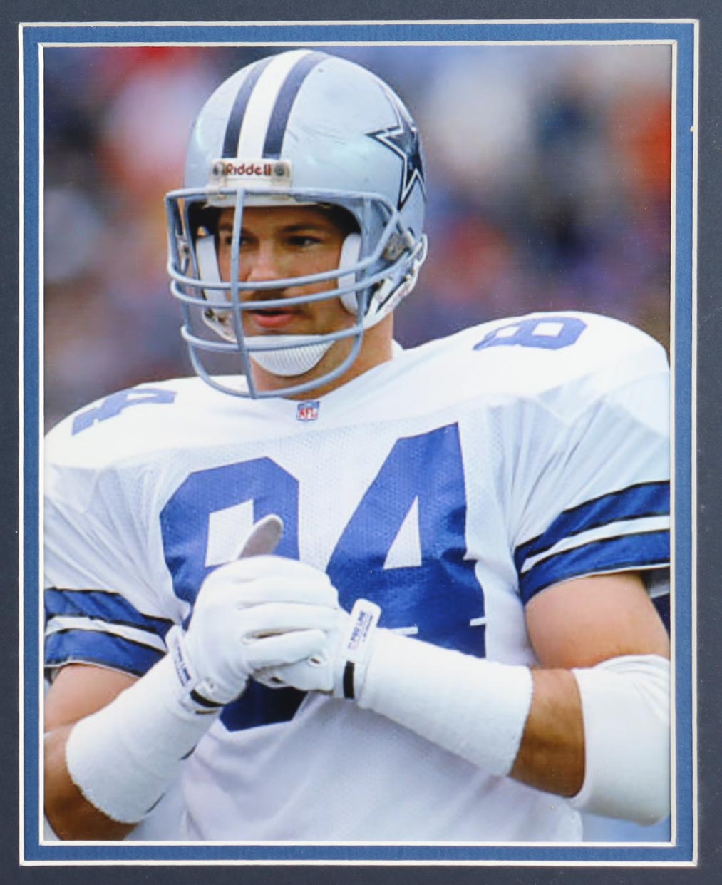 Custom frame display measures approximately 32" x 36" in size and features a jersey that has been hand-signed and inscribed by Jay Novacek. The display also includes (2) 8" x 10" photos