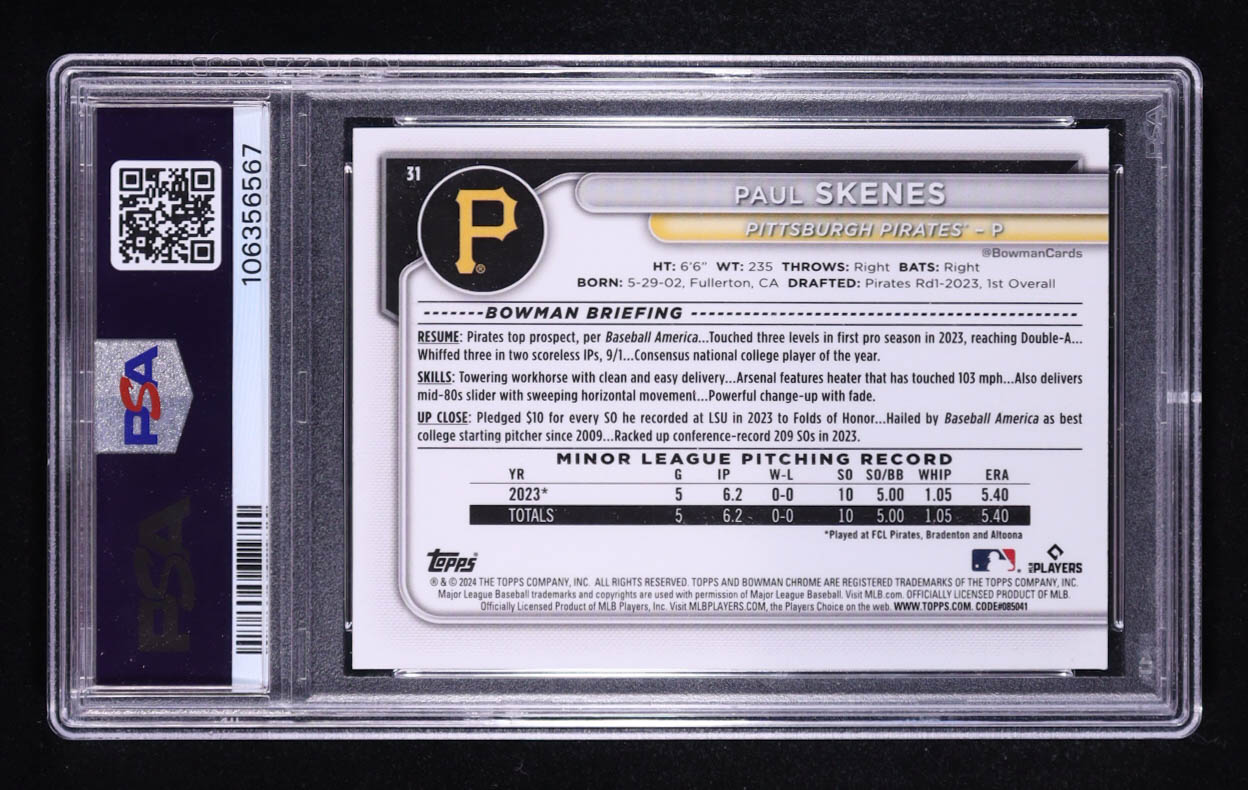 Paul Skenes 2024 Bowman Chrome Fuchsia Refractor #31 #237/299 RC (PSA 10)