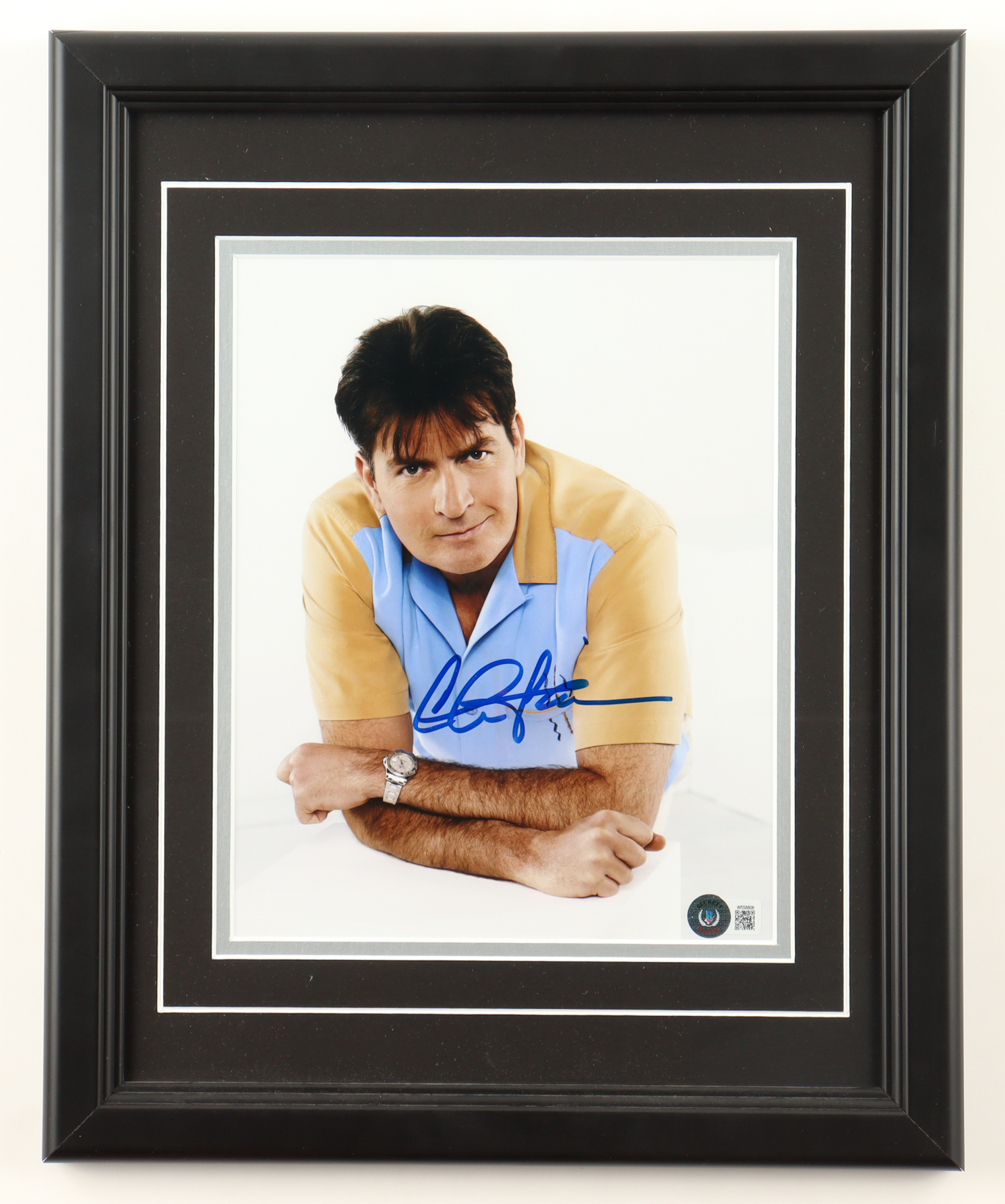 Custom frame measures approximately 13" x 16" in size and features a photo that has been hand-signed by Charlie Sheen.