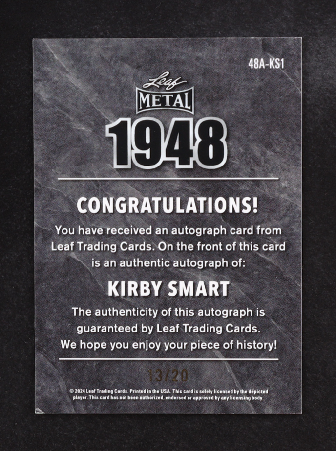 Kirby Smart 2024 Leaf Metal 1948 Autographs Diagonal Shimmer Blue #48ASK1 #13/50