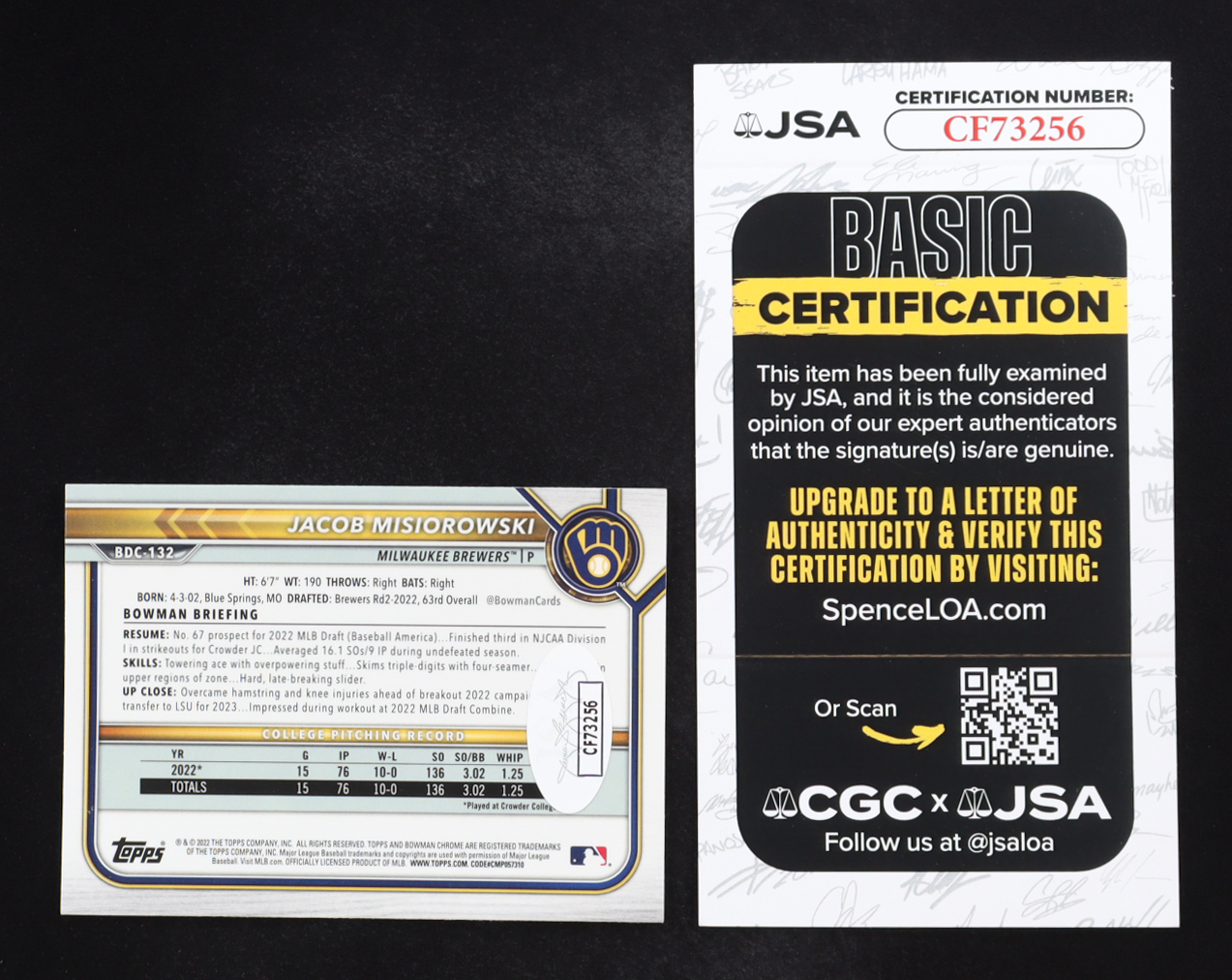 Jacob Misiorowski Signed 2022 Bowman Chrome Draft #BDC132 RC (JSA)