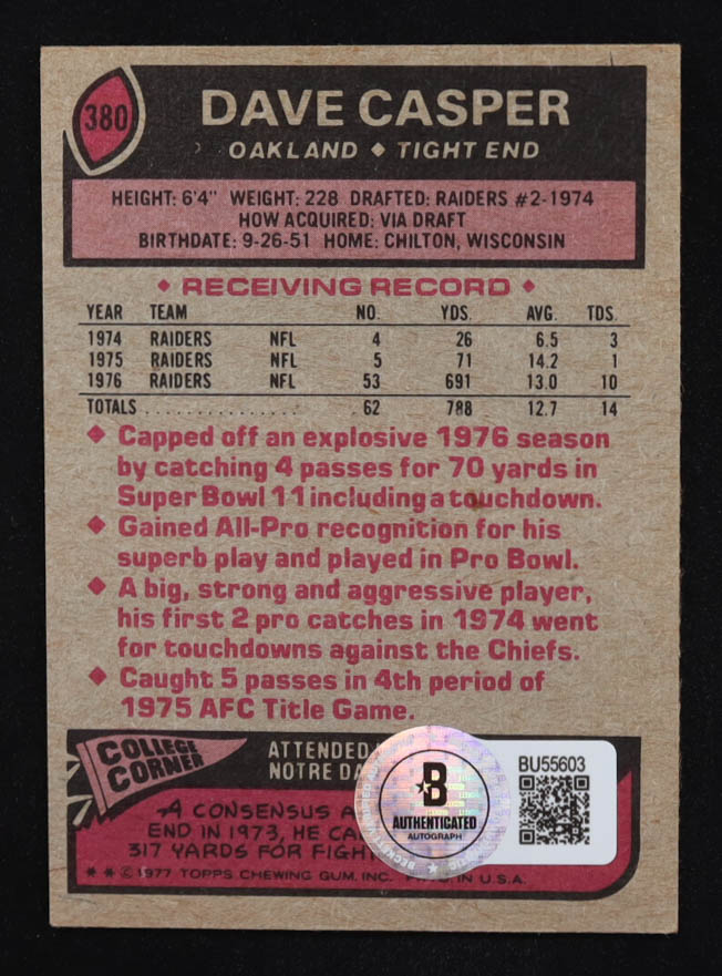 Dave Casper Signed 1977 Topps #380 RC Inscribed "Ghost To The Post" (Beckett)