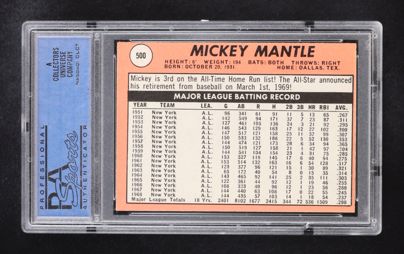 Mickey Mantle 1969 Topps / Last Name In Yellow #500 (PSA 7) (OC)