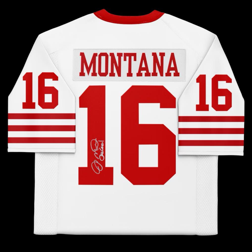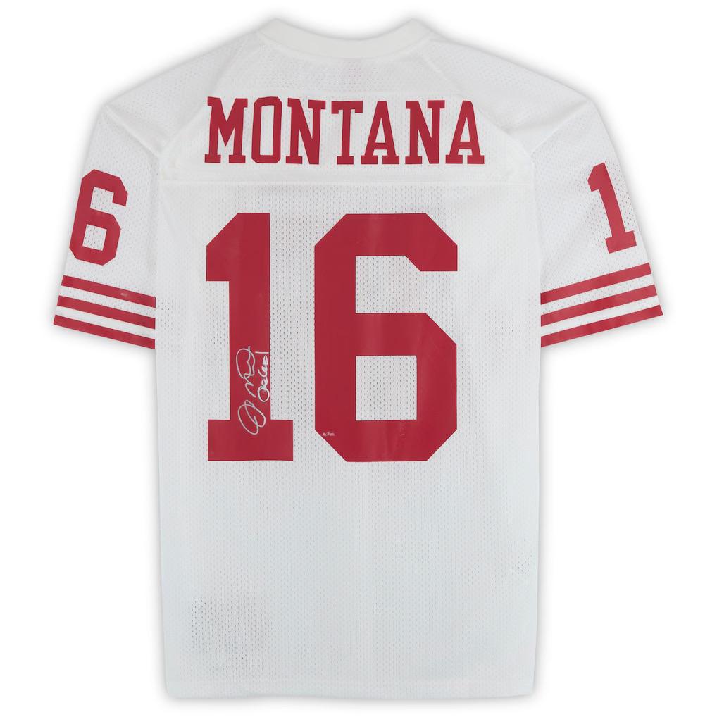 Mitchell & Ness jersey with everything sewn on, size XL. Hand-signed and inscribed by Joe Montana (San Francisco 49ers).