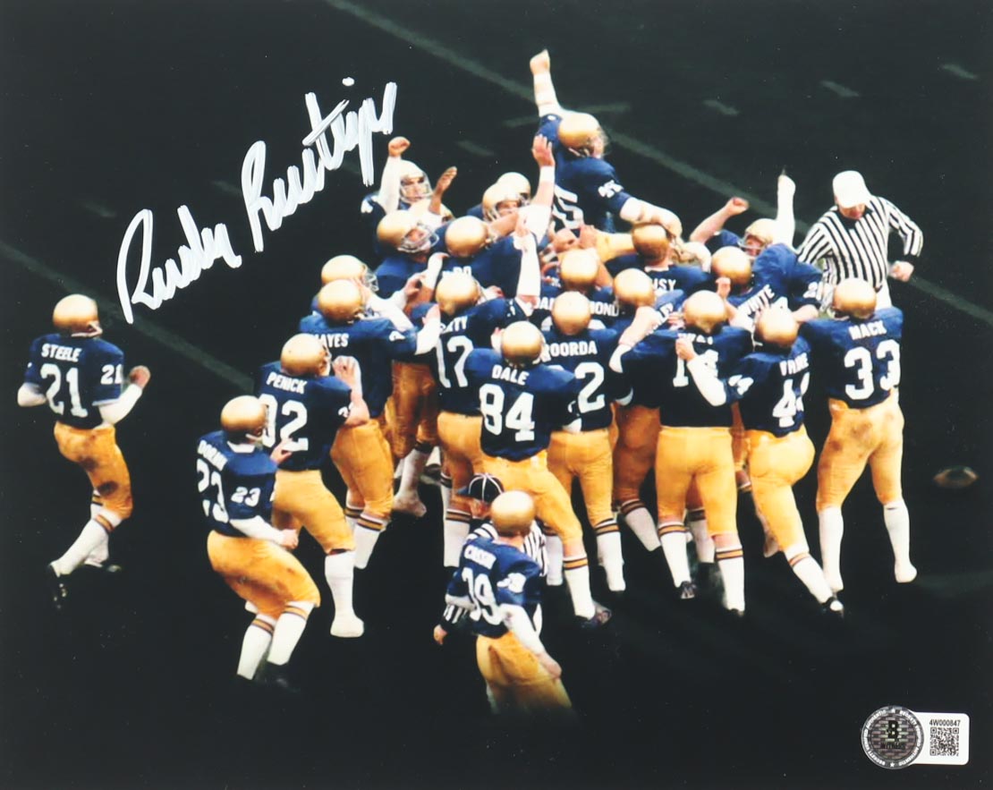 Photo measures 8" x 10" in size and has been hand-signed by Rudy Ruettiger.