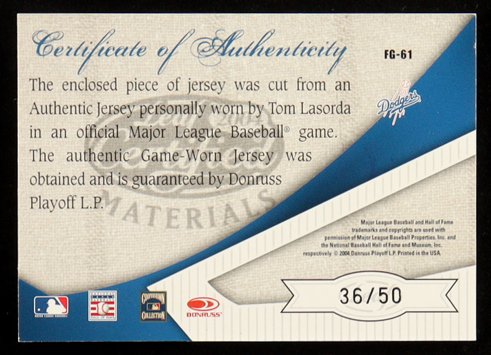 Tommy Lasorda 2004 Leaf Certified Materials Fabric of the Game Reward #61 Jersey #36/50