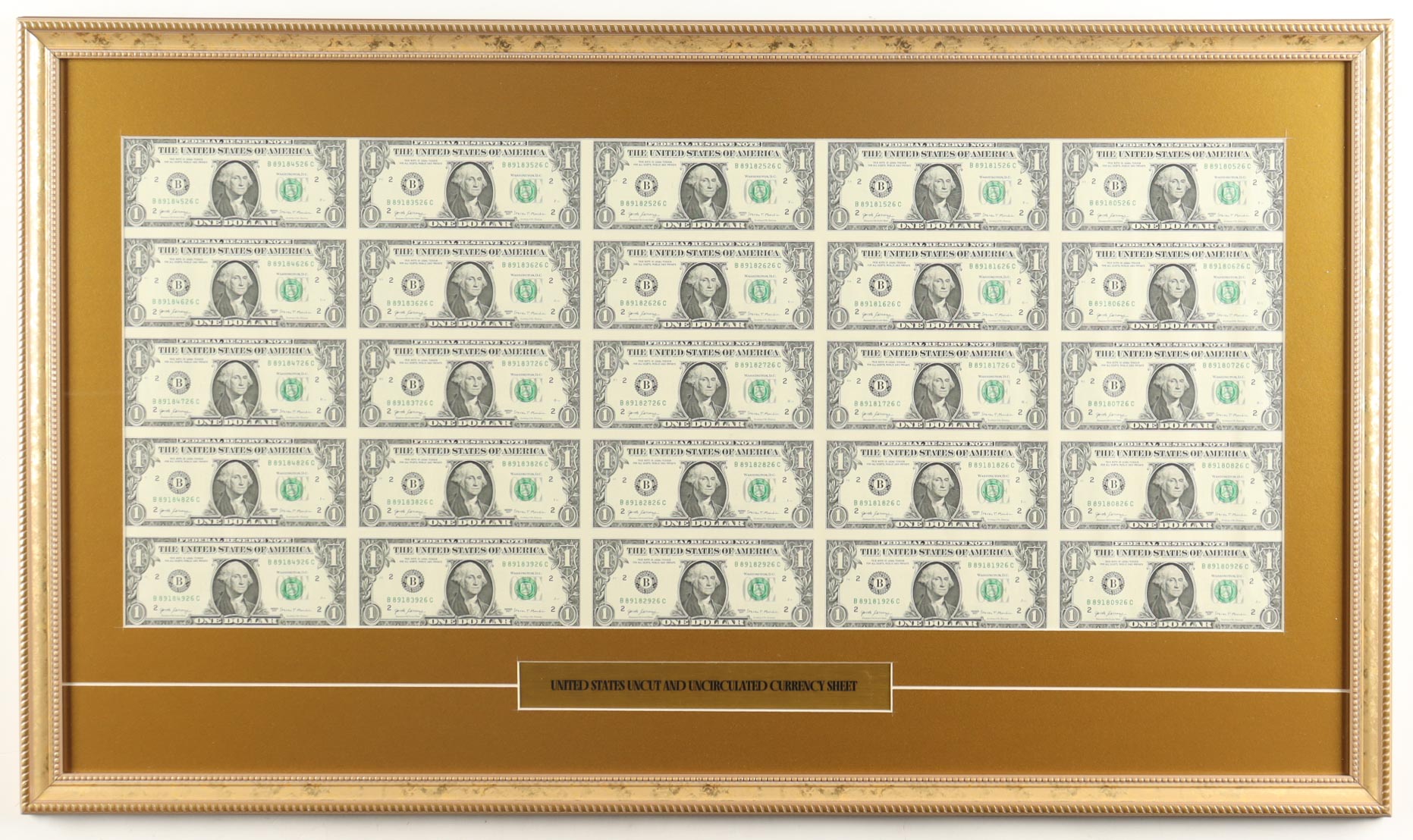Custom frame measures approximately 21" x 36" in size and features an uncut sheet of (25) 2017 U.S. $1 dollar bills. Please note, the display is unsigned.