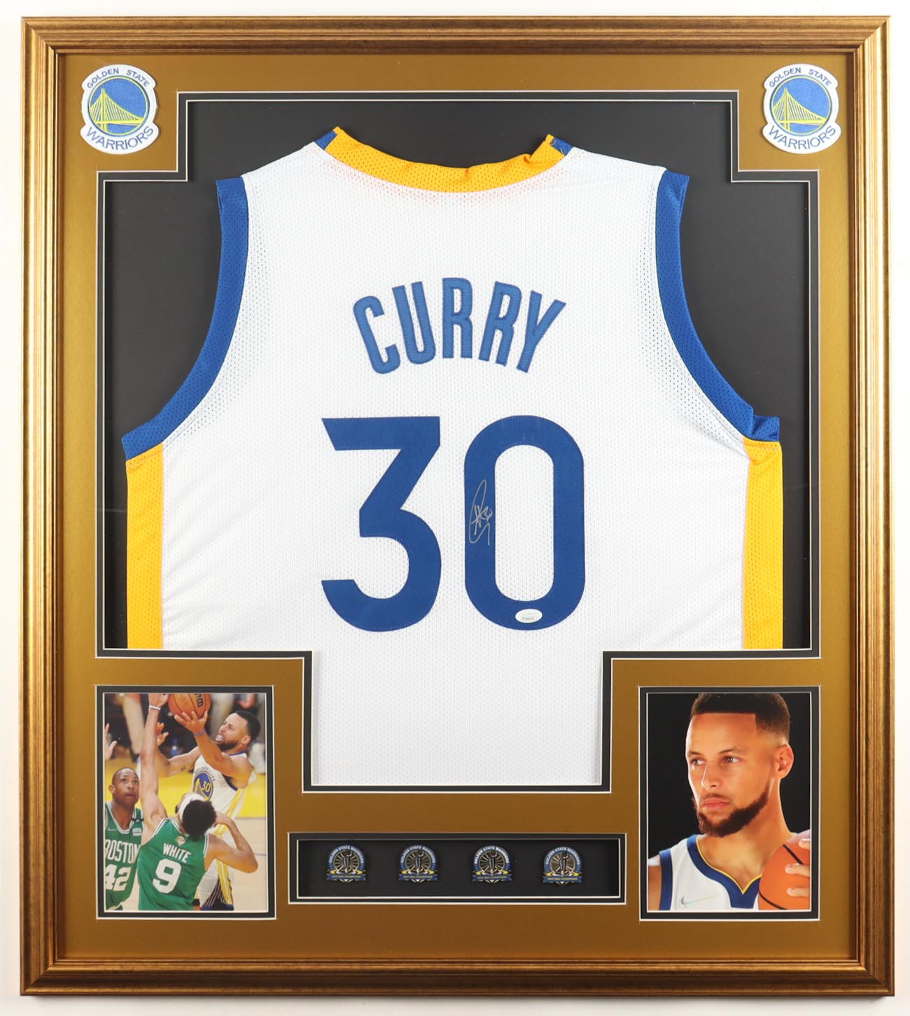 Stephen Curry Signed Custom Framed Jersey Display with (4) NBA Finals Pins & (2) Cloth Team Logo Patches (JSA)