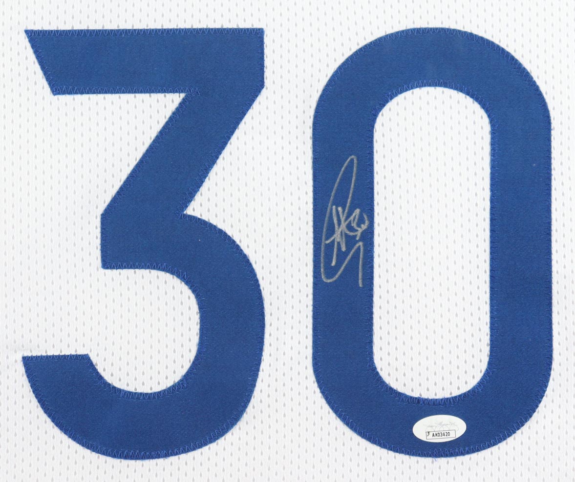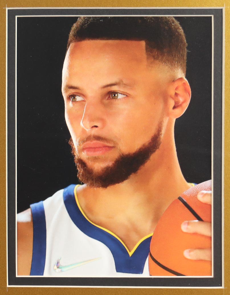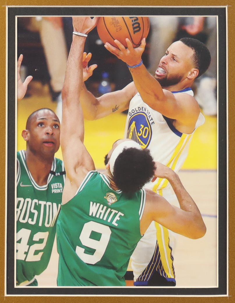 Custom frame display measures approximately 32" x 36" in size and features a jersey that has been hand-signed by Stephen Curry. The display also includes a (4) NBA Finals Pins, (2) 8" x 10" photos and (2) Cloth Team Logo patches.