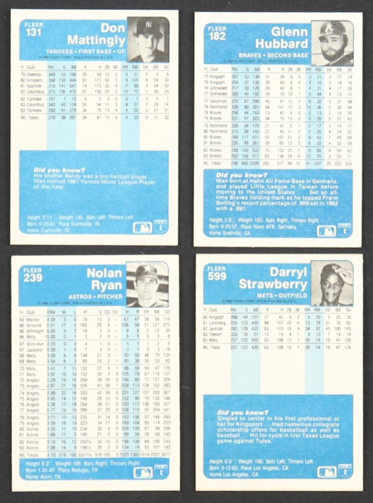 1984 Fleer Baseball Complete Set of (660) Cards with Don Mattingly #131 RC, Darryl Strawberry #599 RC, Glenn Hubbard #182, Nolan Ryan #239