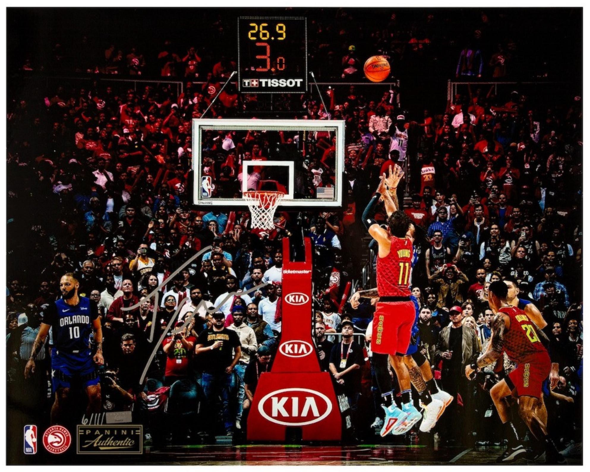 Photo measures 16" x 20" in size and has been hand-signed by Trae Young (Atlanta Hawks). This photograph is limited to #/111 and you will receive a random number from the edition.