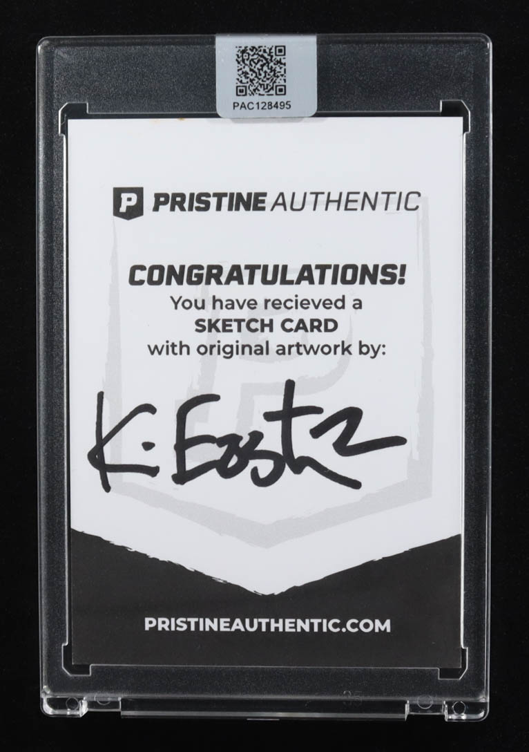 This sketch card includes original art by the co-creator of the Teenage Mutant Ninja Turtles, Kevin Eastman. The card is hand-signed on the back by Eastman.