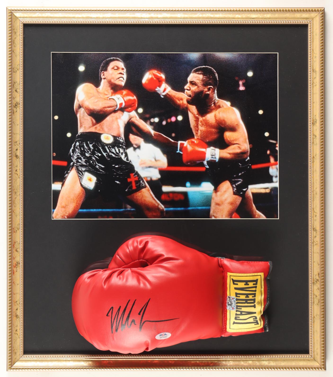 Custom frame measures approximately 21" x 24" in size and features a pair of Everlast boxing training glove that has been hand-signed by Mike Tyson (HOF). Display also includes an 11" x 14" photo.