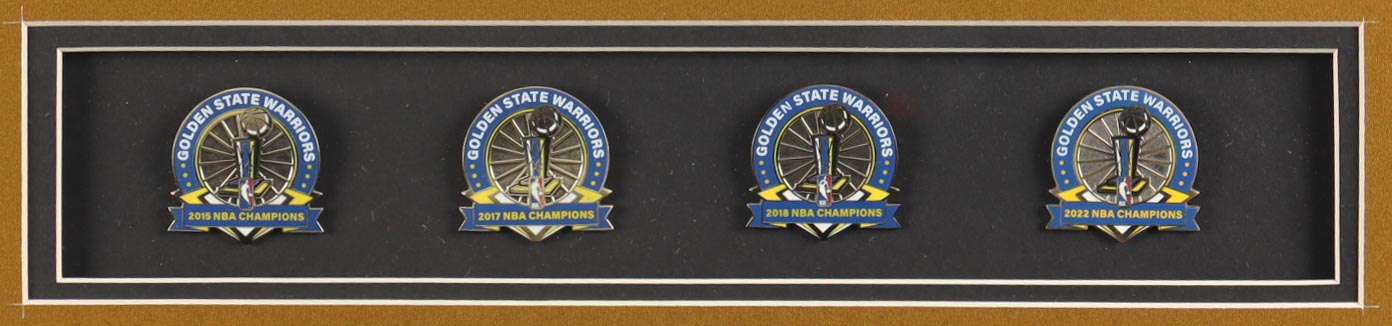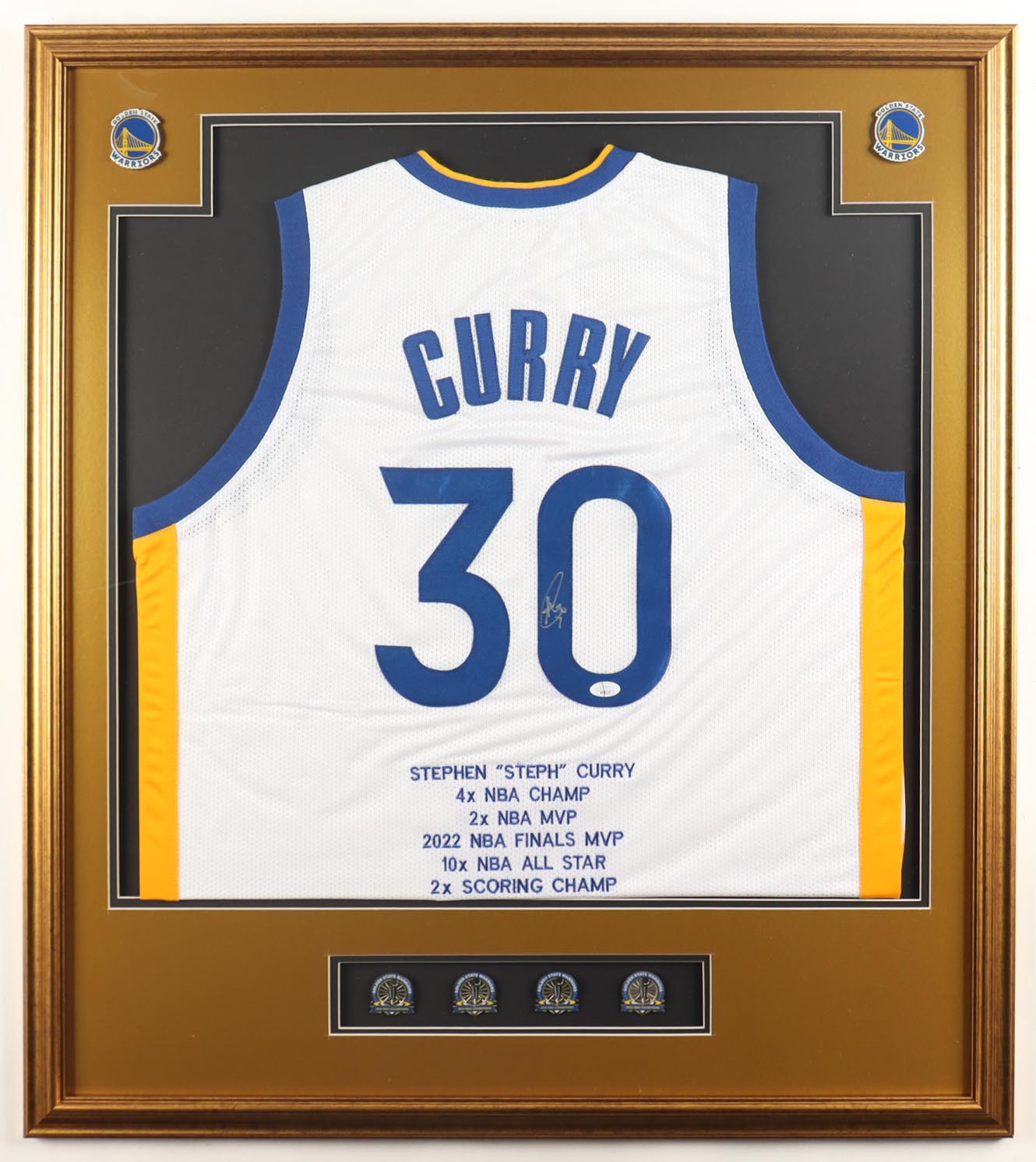 Custom frame display measures approximately 32" x 36" in size and features a jersey that has been hand-signed by Stephen Curry. The display also includes a (4) NBA Finals Pins, and (2) Metal Team Logo Emblems. Please see photos for more details.