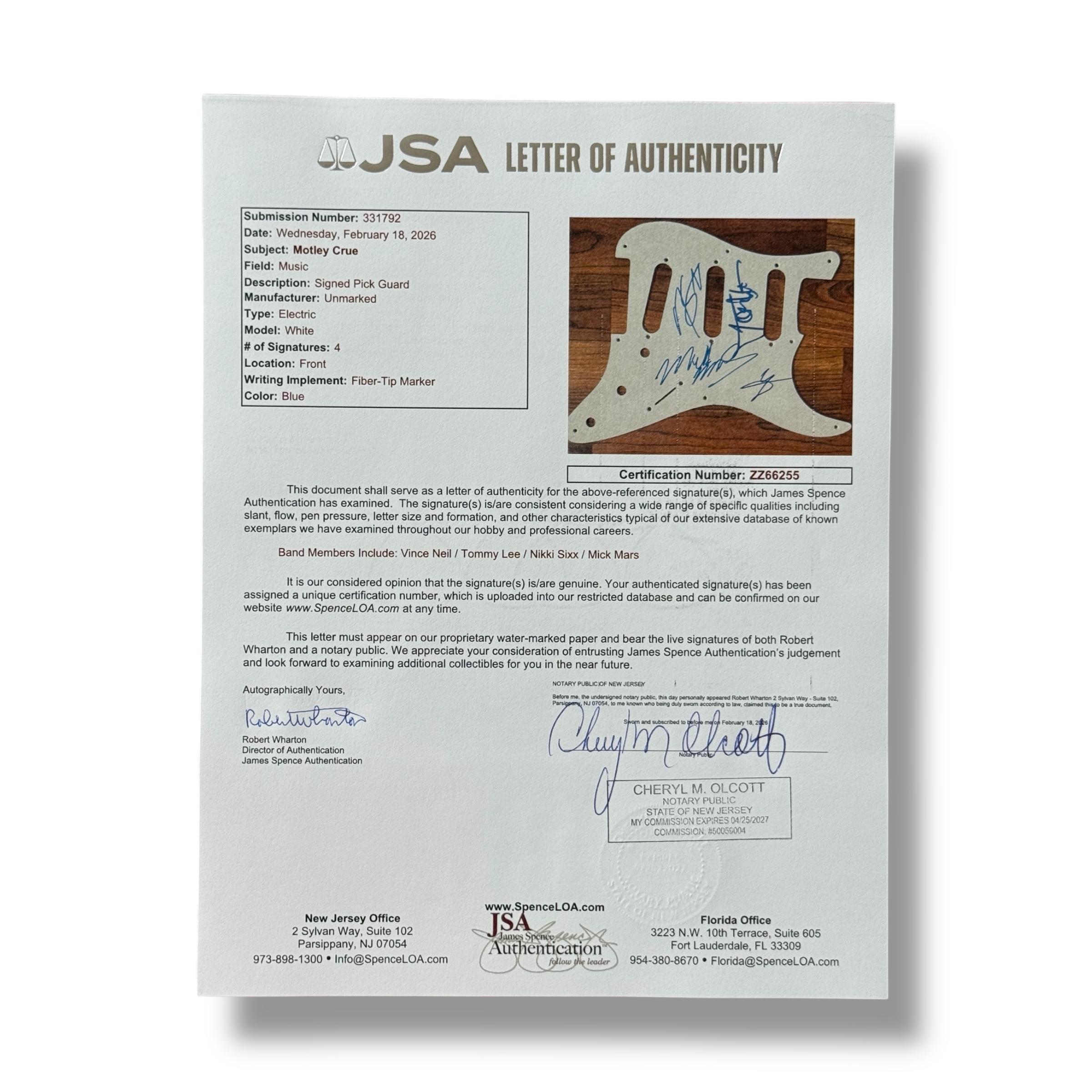 Custom Autograph Edition Stratocaster style electric guitar measures approximately 39" in length and has been hand-signed on the pickguard by Vince Neil (lead singer), Tommy Lee (drummer), Mick Mars (lead guitarist), and Nikki Sixx (bassist).