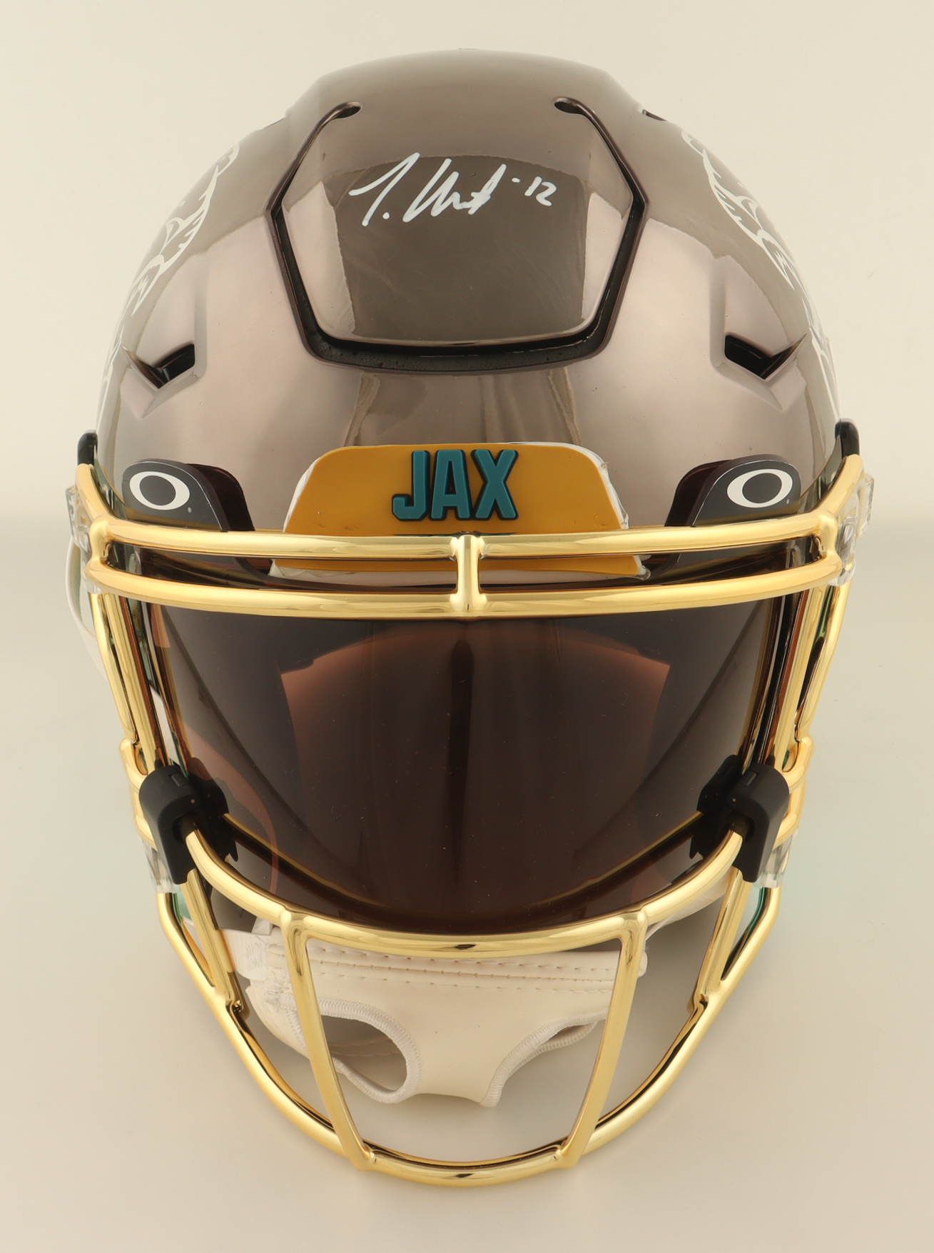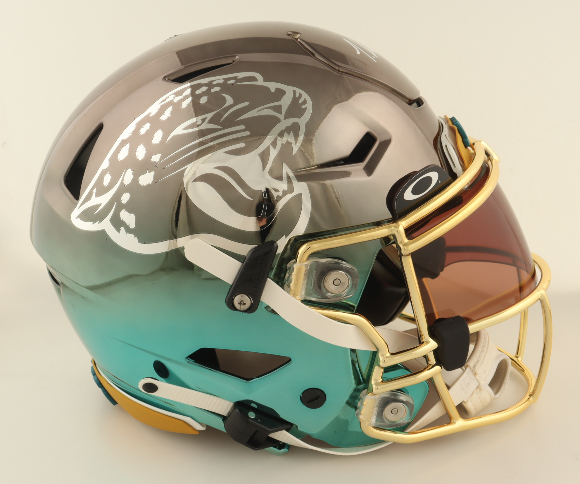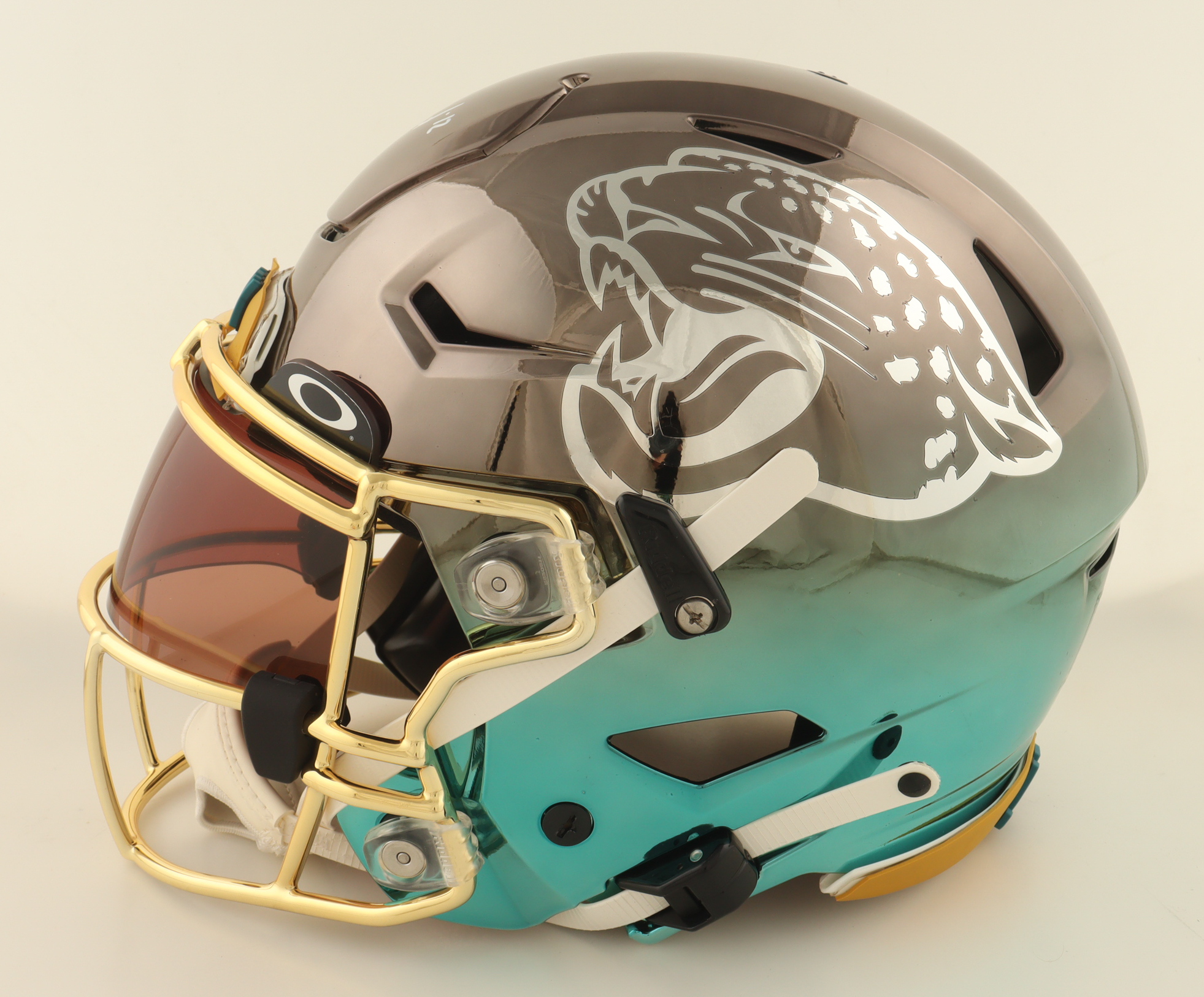 Riddell Jacksonville Jaguars Authentic On-field full-size SpeedFlex football helmet with visor and custom design. Hand-signed by Travis Hunter.