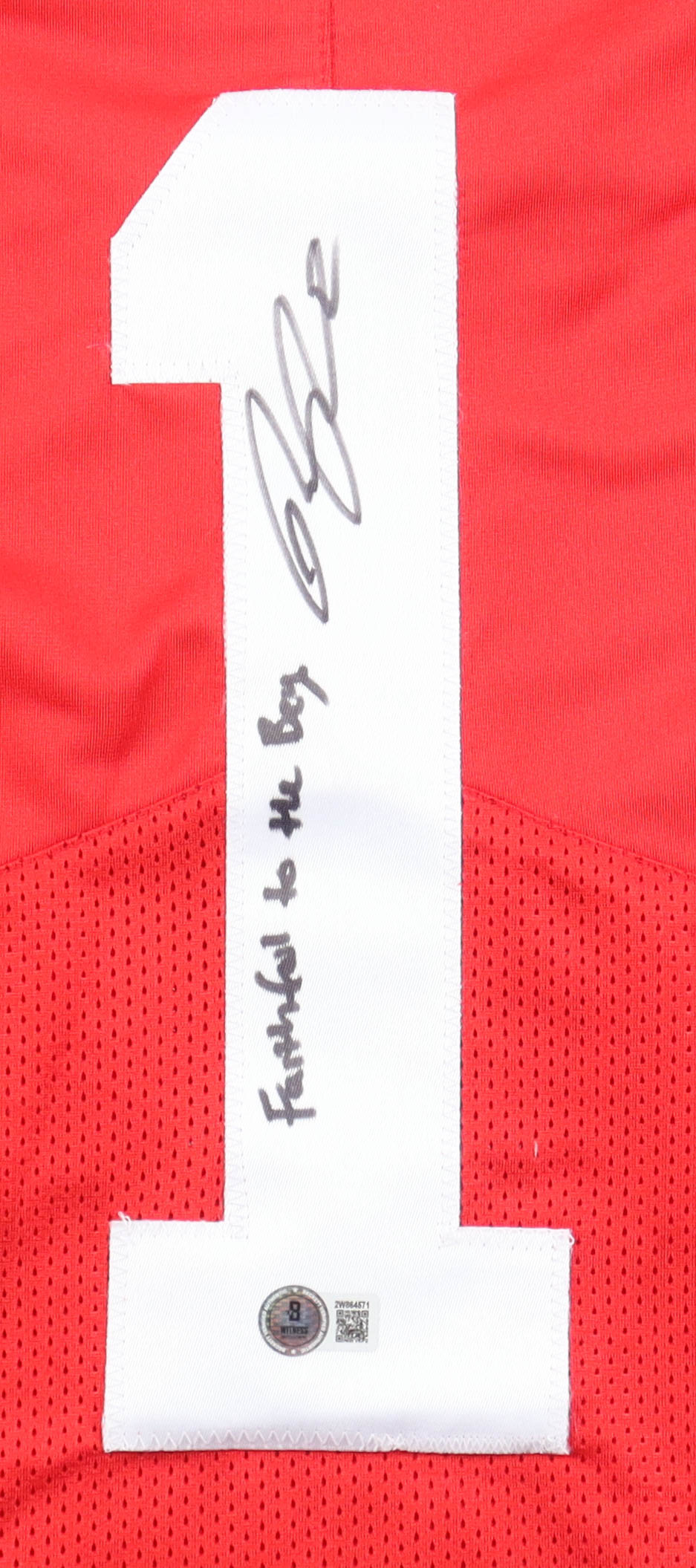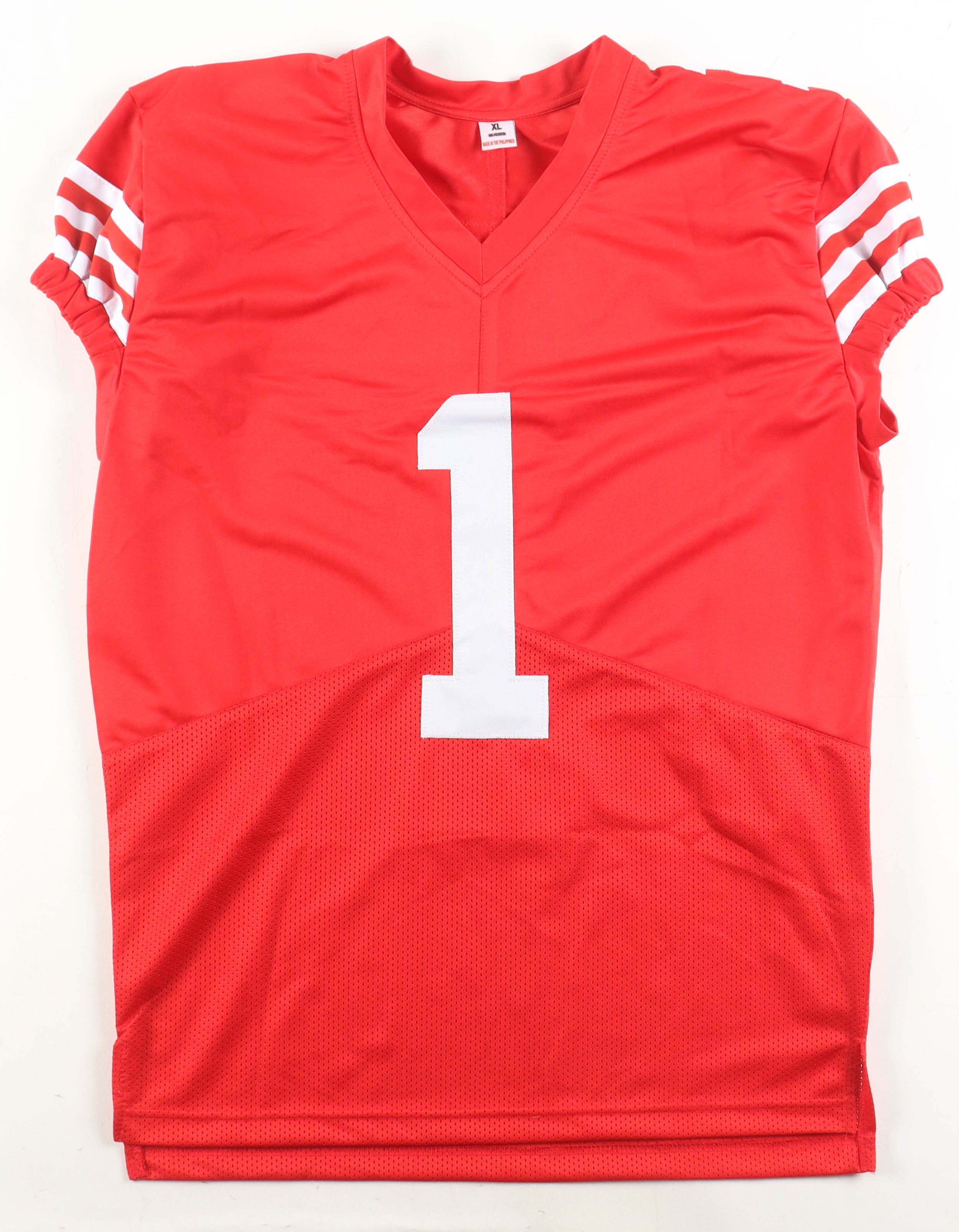 Custom jersey. Everything sewn on, size XL. Hand-signed and inscribed by Ricky Pearsall.