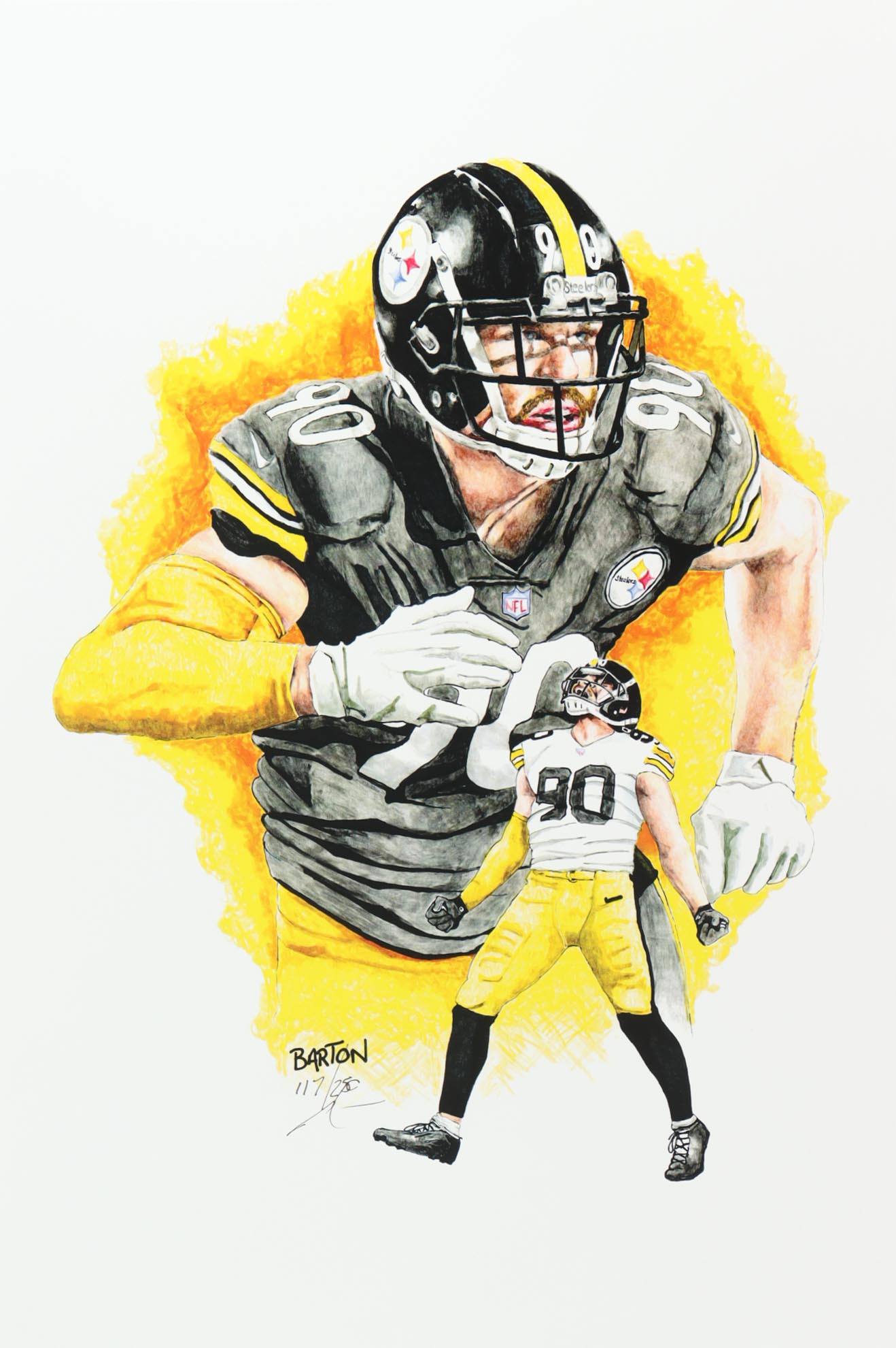 This limited edition giclee on high-quality matte fine art smooth 230gsm paper measures approximately 12" x 18" in size. The piece is hand-signed and numbered by the artist, Brian Barton and features T.J. Watt (Pittsburgh Steelers).