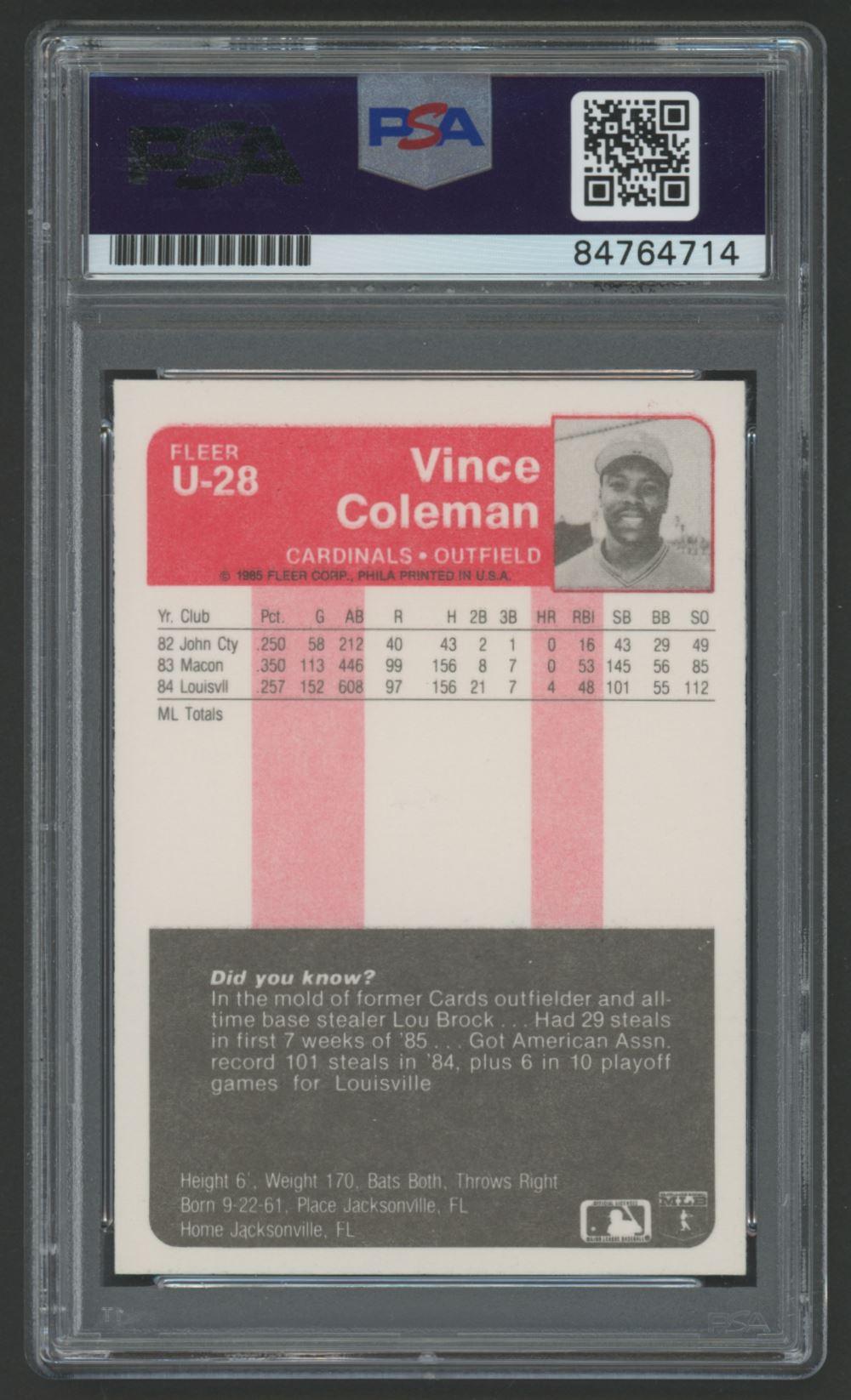 Vince Coleman Signed 1985 Fleer Update #28 XRC (PSA)
