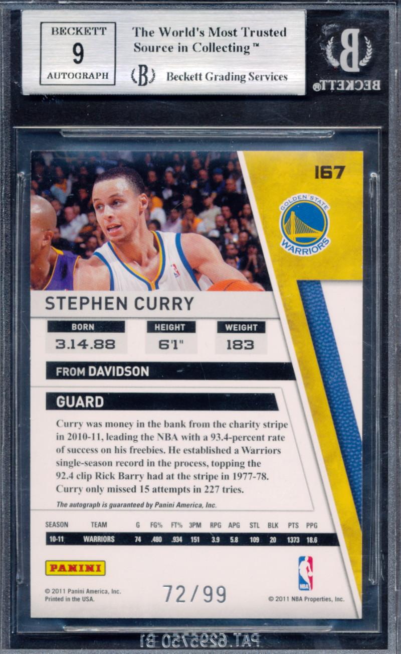 Stephen Curry 2010-11 Panini Season Update Signatures #167 #72/99 (BGS 9 | Autograph Graded 9)