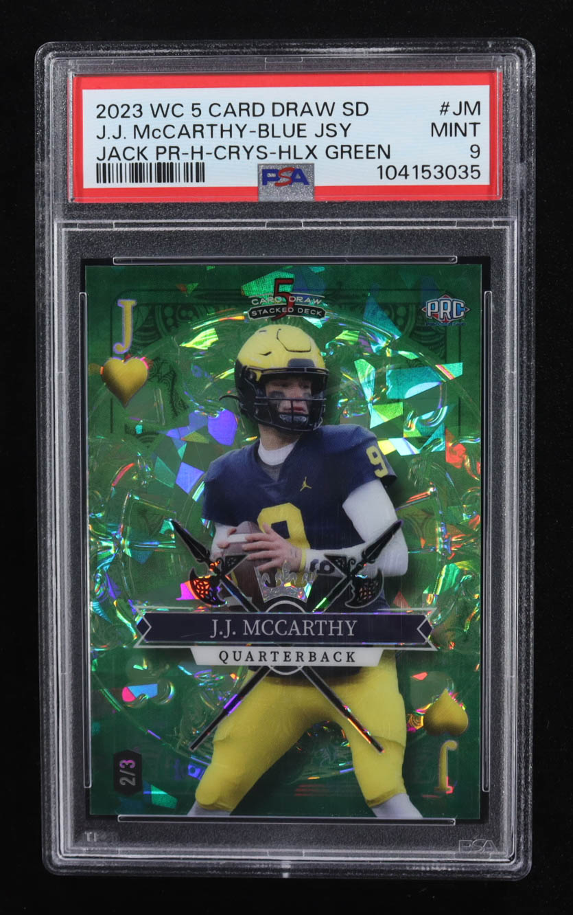 J.J. McCarthy. 2023 Wild Card 5 Card Draw Stacked Deck Jack of Hearts Green Crystal #SDJM RC #2/3 (PSA 9)