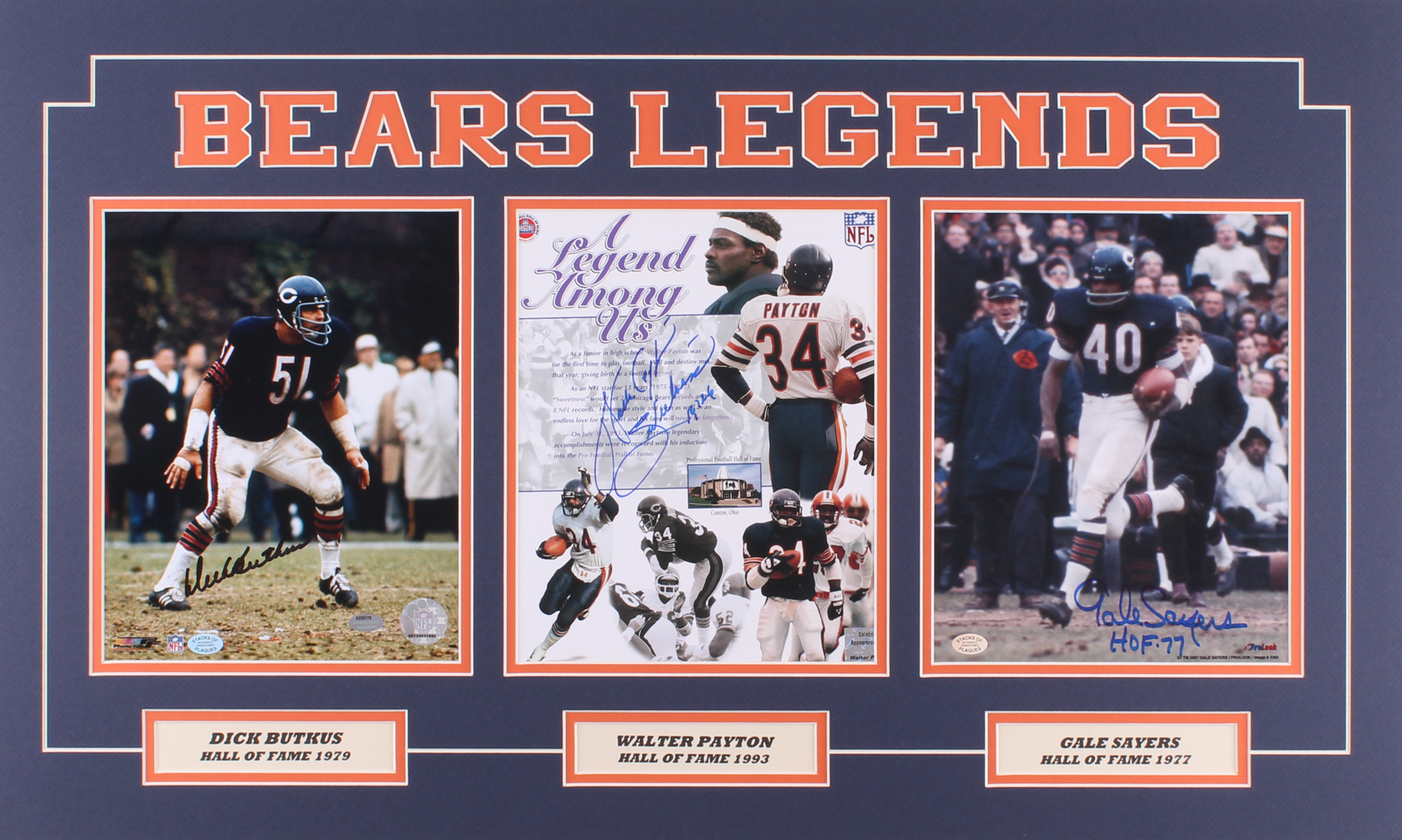Custom matted photo display measures 18" x 30" in size and features (3) photos that have been hand-signed in felt-tip pen by Walter Payton (HOF), Dick Butkus (HOF) and Gale Sayers (HOF).