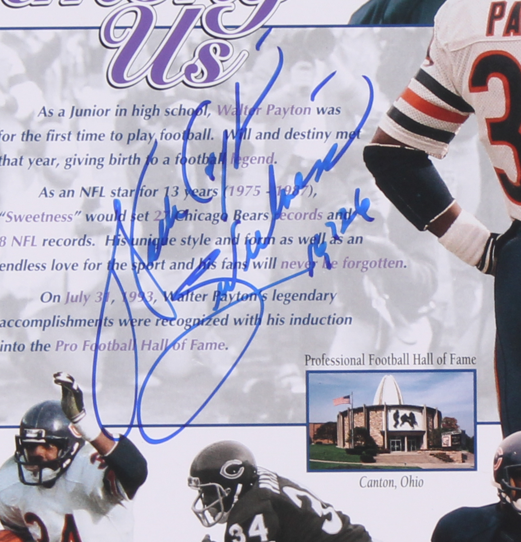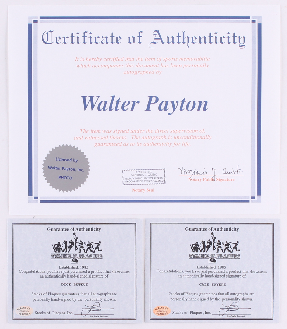 The lot / autograph(s) includes (2) official Stacks of Plaques - Est. 1985, celebrating 30 years in the business - hologram and matching COA as well as an official Schwartz Spots COA and an official Walter Payton COA for authenticity purposes.