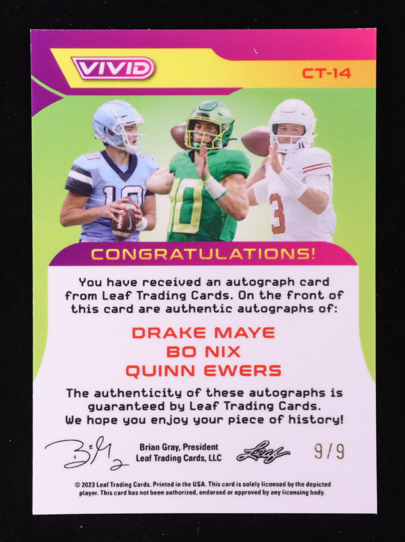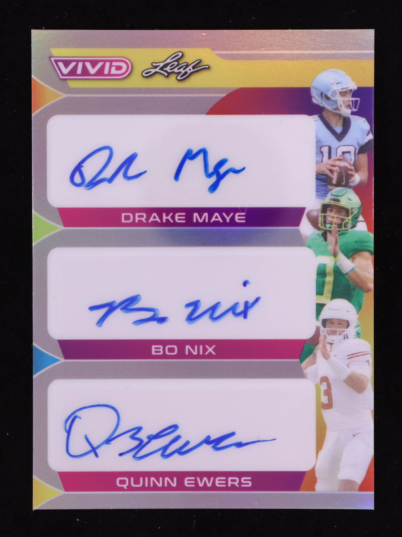 Drake Maye / Bo Nix / Quinn Ewers 2023 Leaf Vivid Colorful Trios Autographs #CT-14 RC #9/9