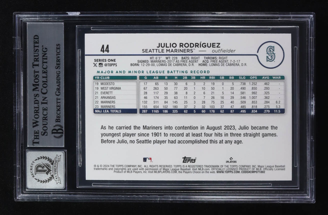 Julio Rodriguez Signed 2024 Topps #44 (Beckett | Auto Grade BGS 10)