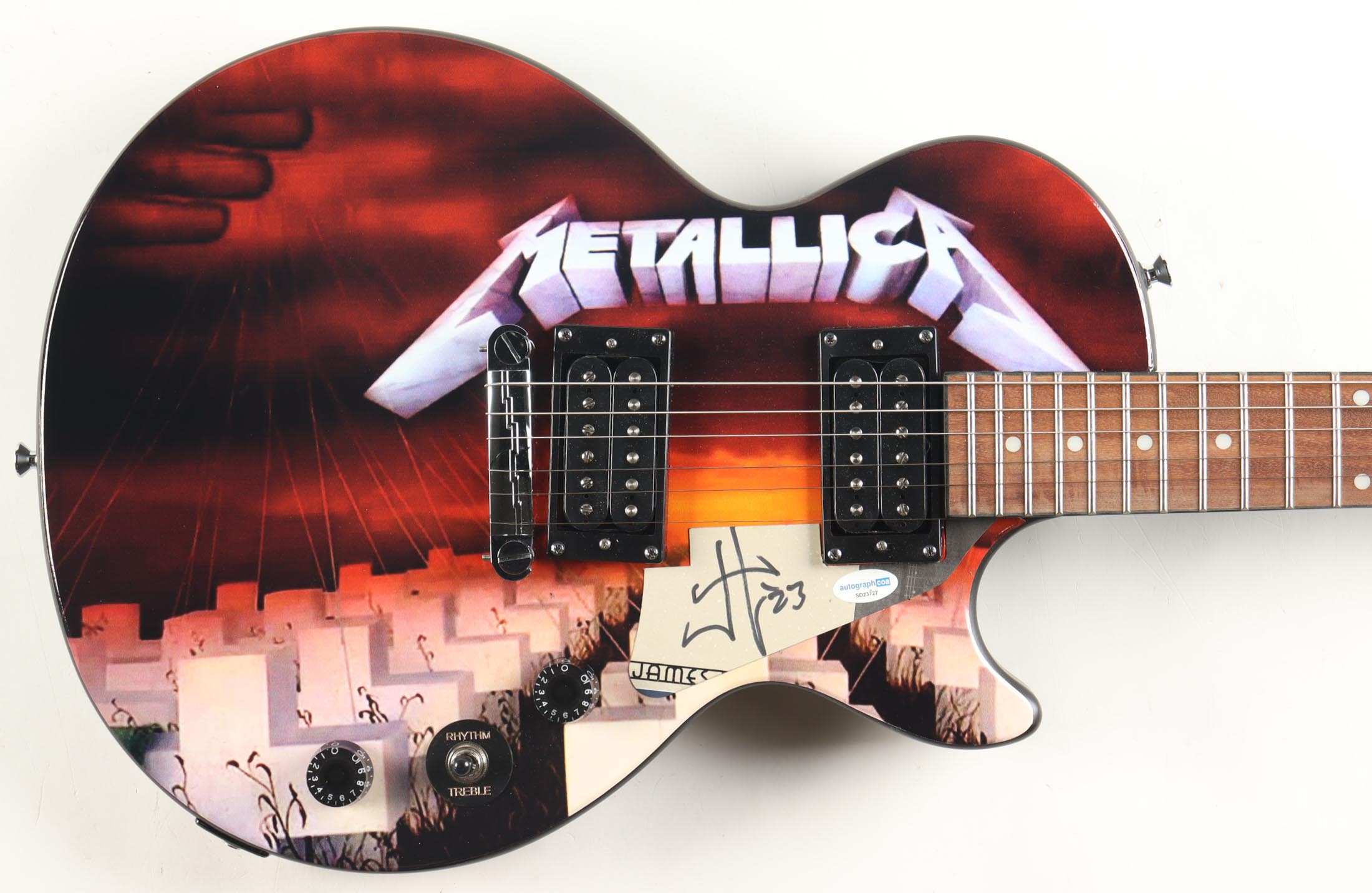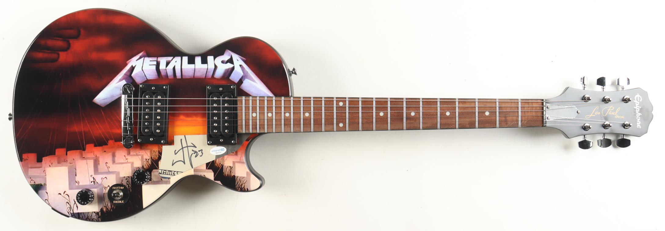 Epiphone Les Paul Special Electric Guitar measures approximately 39" in length and has been hand-signed on a cut that is repurposed as the pick-guard by James Hetfield.