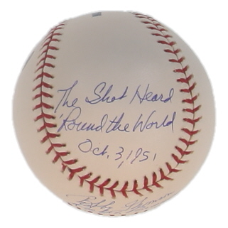Rawlings Official Major League Baseball. Hand-signed and inscribed by Ralph Branca (D. 2016, Brooklyn Dodgers) and Bobby Thomson (D. 2010, New York Giants).