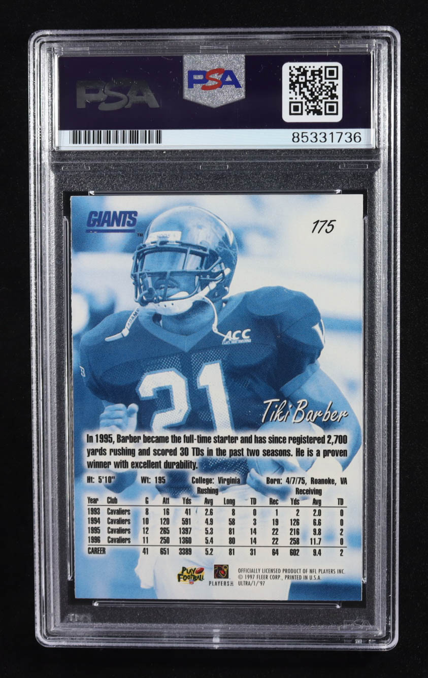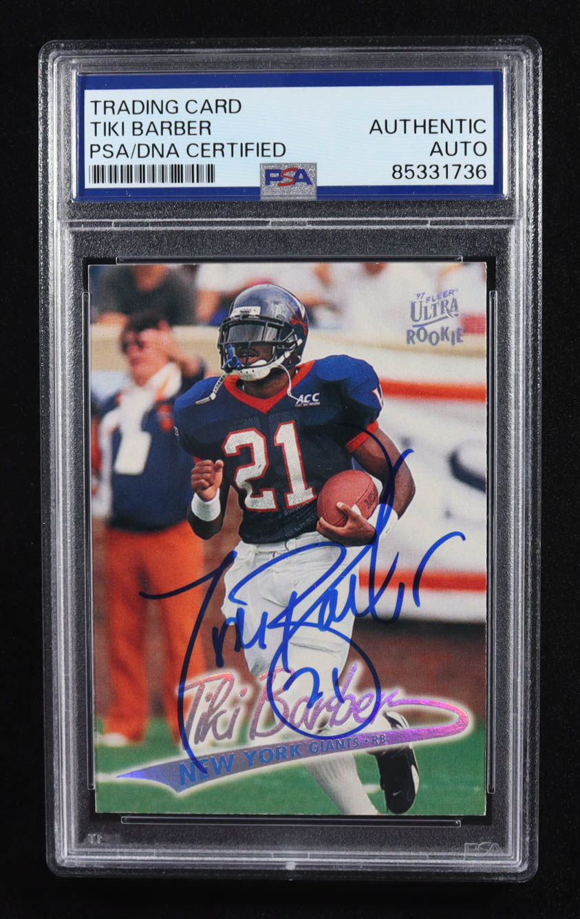 Tiki Barber Signed 1997 Inscribed "21" Fleer Ultra Rookie Trading Card Auto #175 RC (PSA | Autograph Grade PSA Authentic)