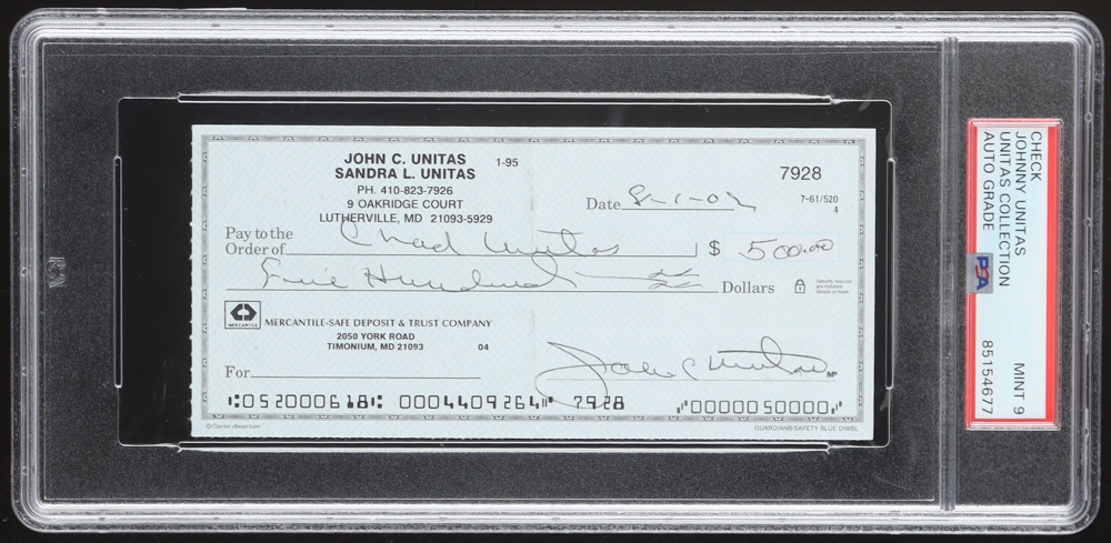 Johnny Unitas Signed 2002 Personal Check (PSA | Autograph Graded 9)