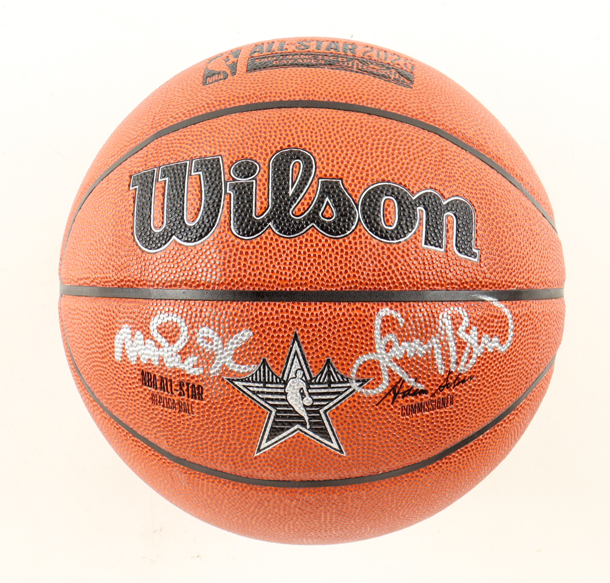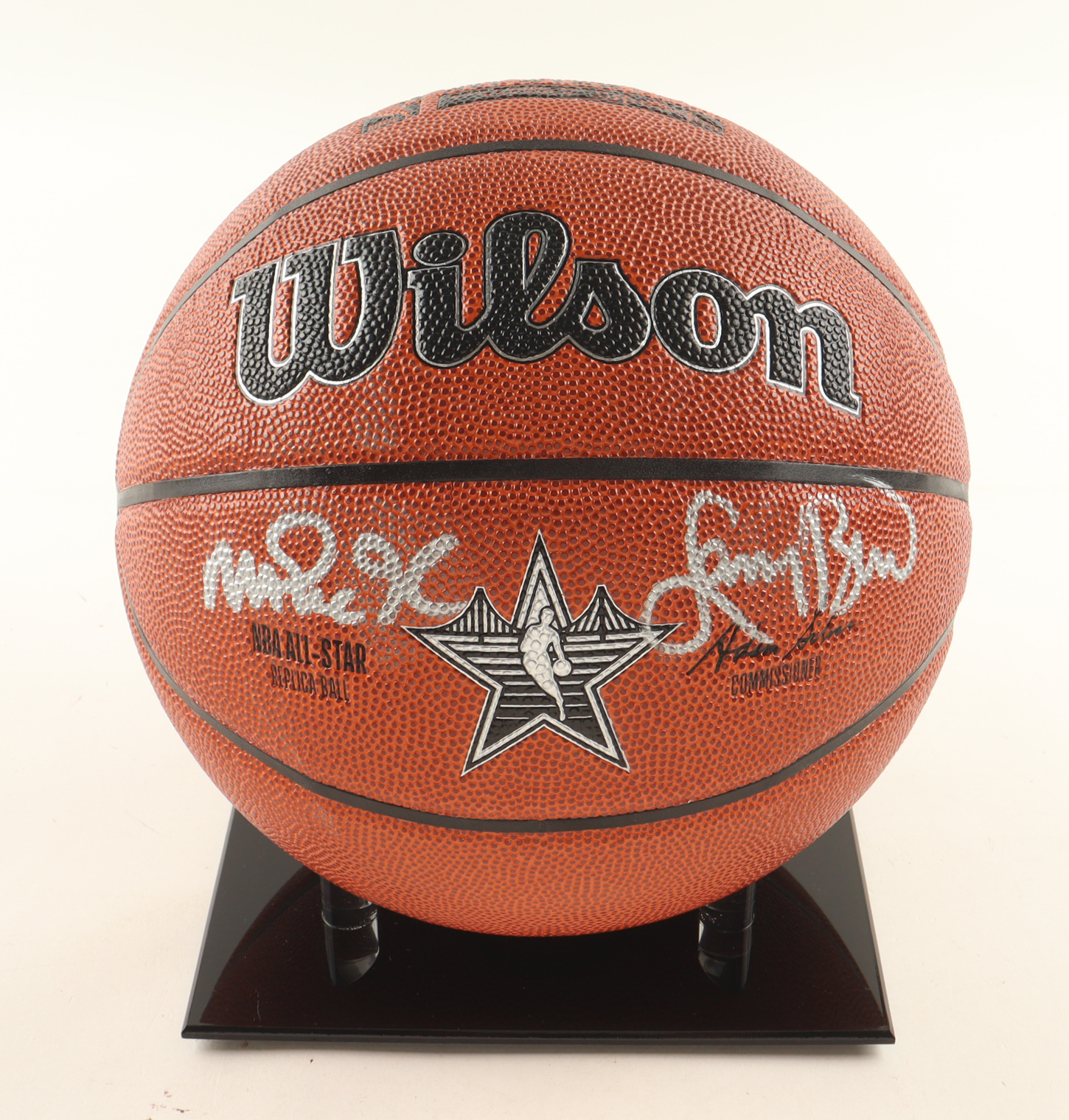 NBA Silver All-Star Logo Basketball. Hand-signed by Magic Johnson (Los Angeles Lakers, HOF) and Larry Bird (Boston Celtics, HOF). The display stand is included as shown.