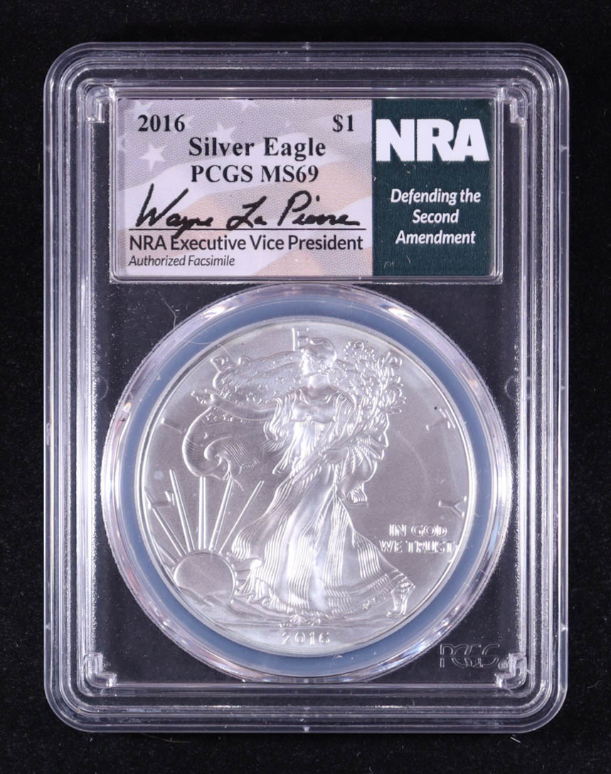 2016 American Silver Eagle, NRA Defending the 2nd Amendment - Wayne LaPierre Signature Label (PCGS MS69)