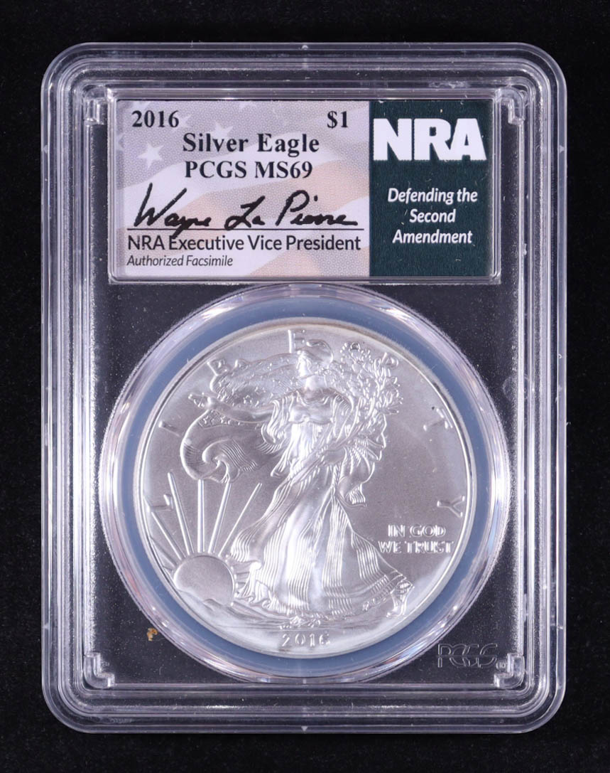 2016 American Silver Eagle, NRA Defending the 2nd Amendment - Wayne LaPierre Signature Label (PCGS MS69)