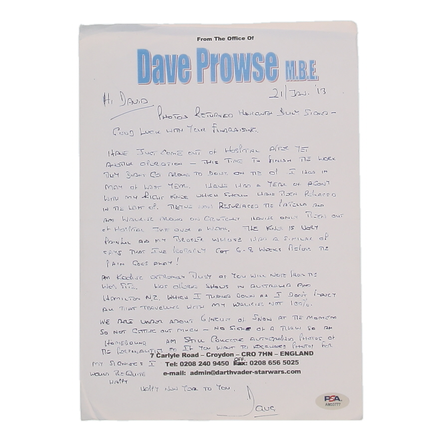 Hand written letter measures approximately 8.5" x 11.5" in size and has been hand-written and signed by Dave Prowse. Please note, the edges are creased and the letter has been personalized, "Hi David".