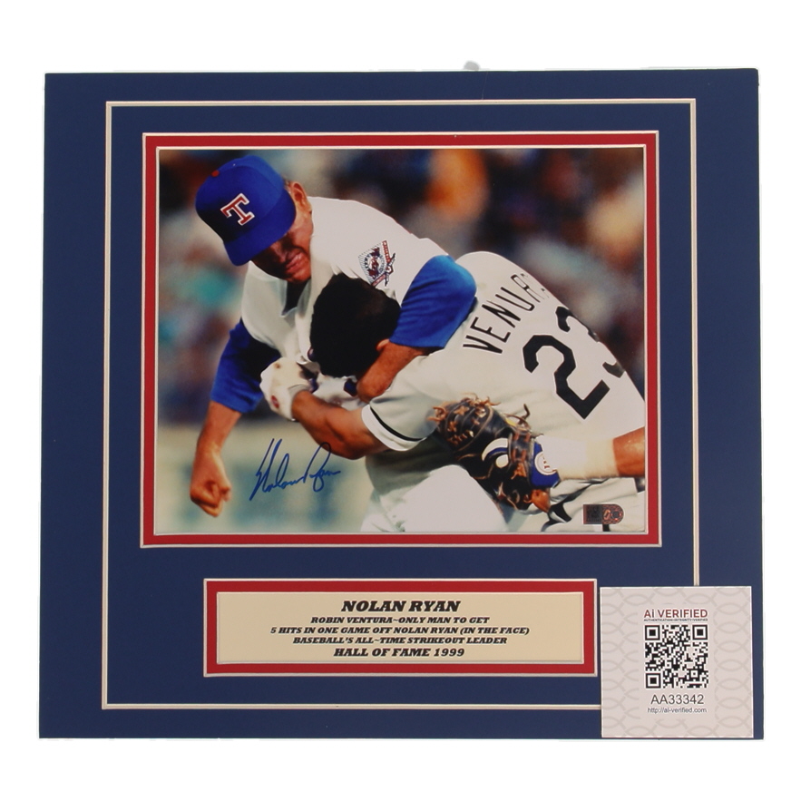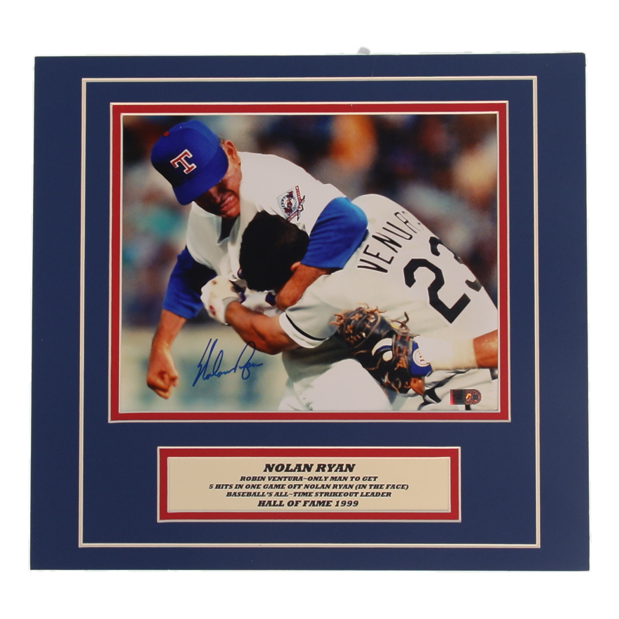 Custom matted display measures 13" x 14" in size and features a photo that has been hand-signed by Nolan Ryan (Texas Rangers). Display also includes an unsigned name plaque.