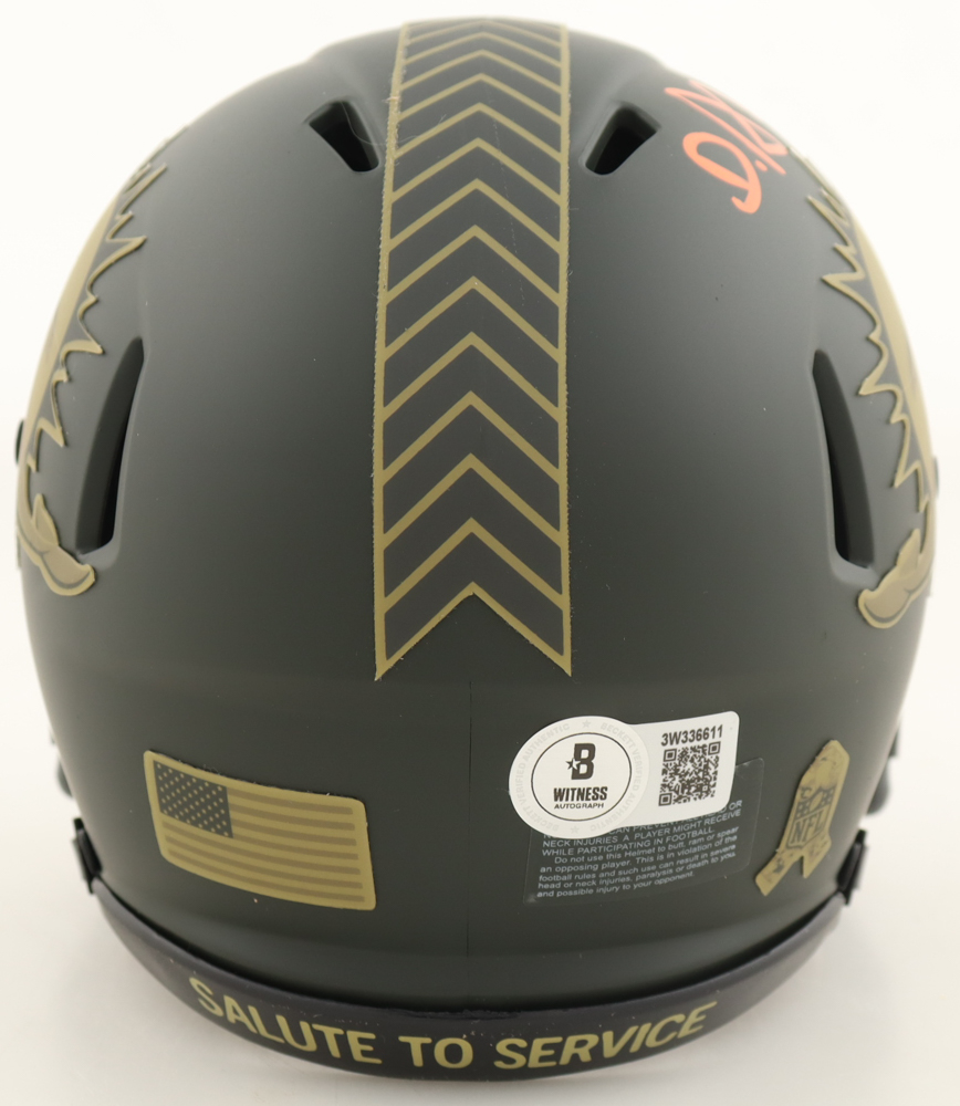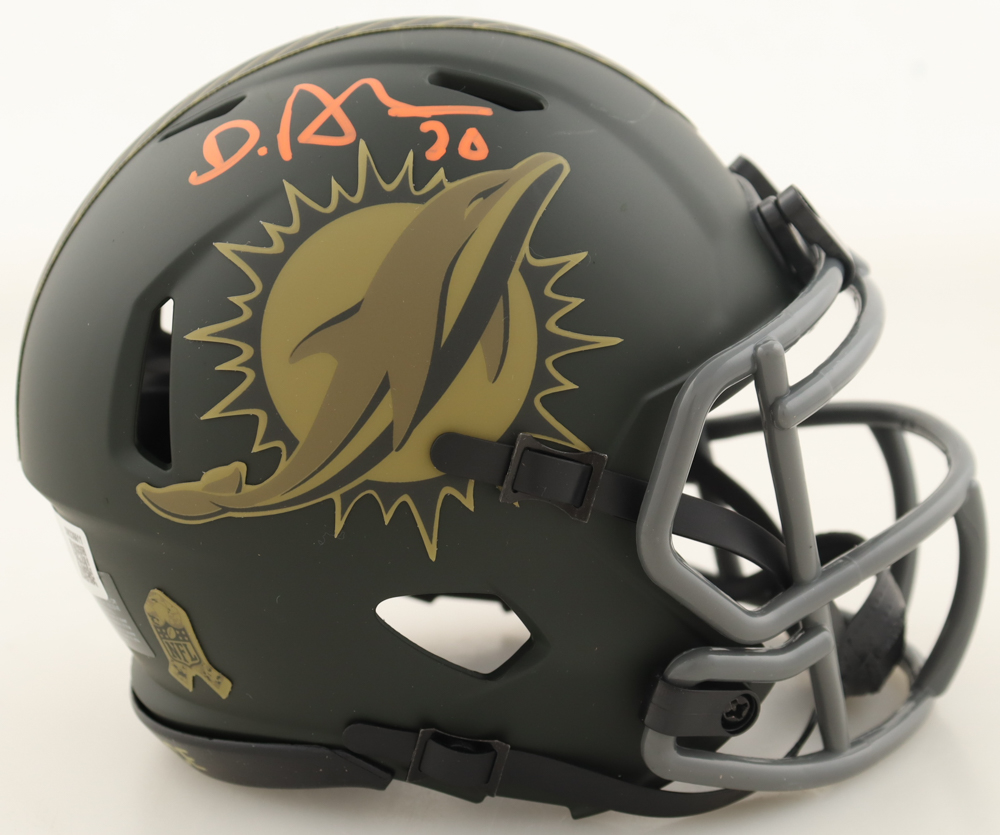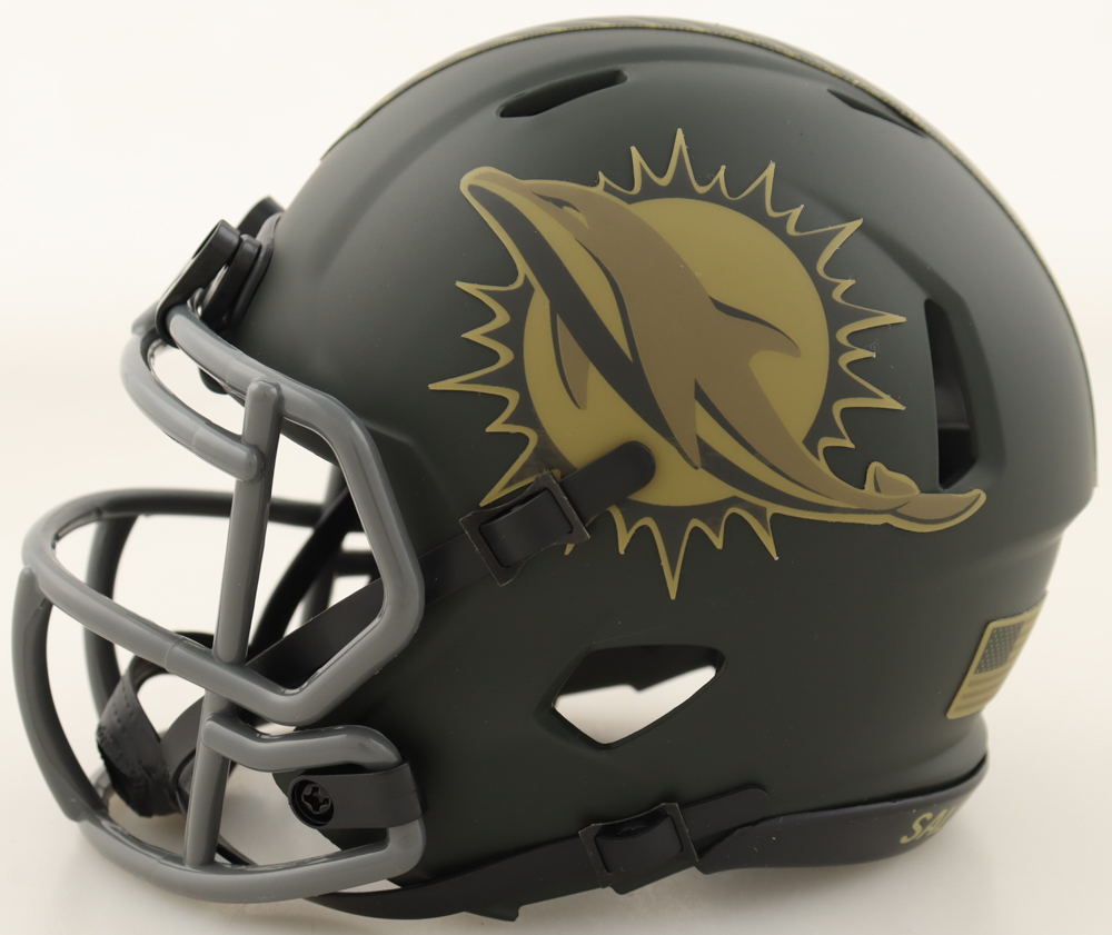 Riddell Miami Dolphins Salute To Service Alternate speed mini helmet. Hand-signed by De’Von Achane.